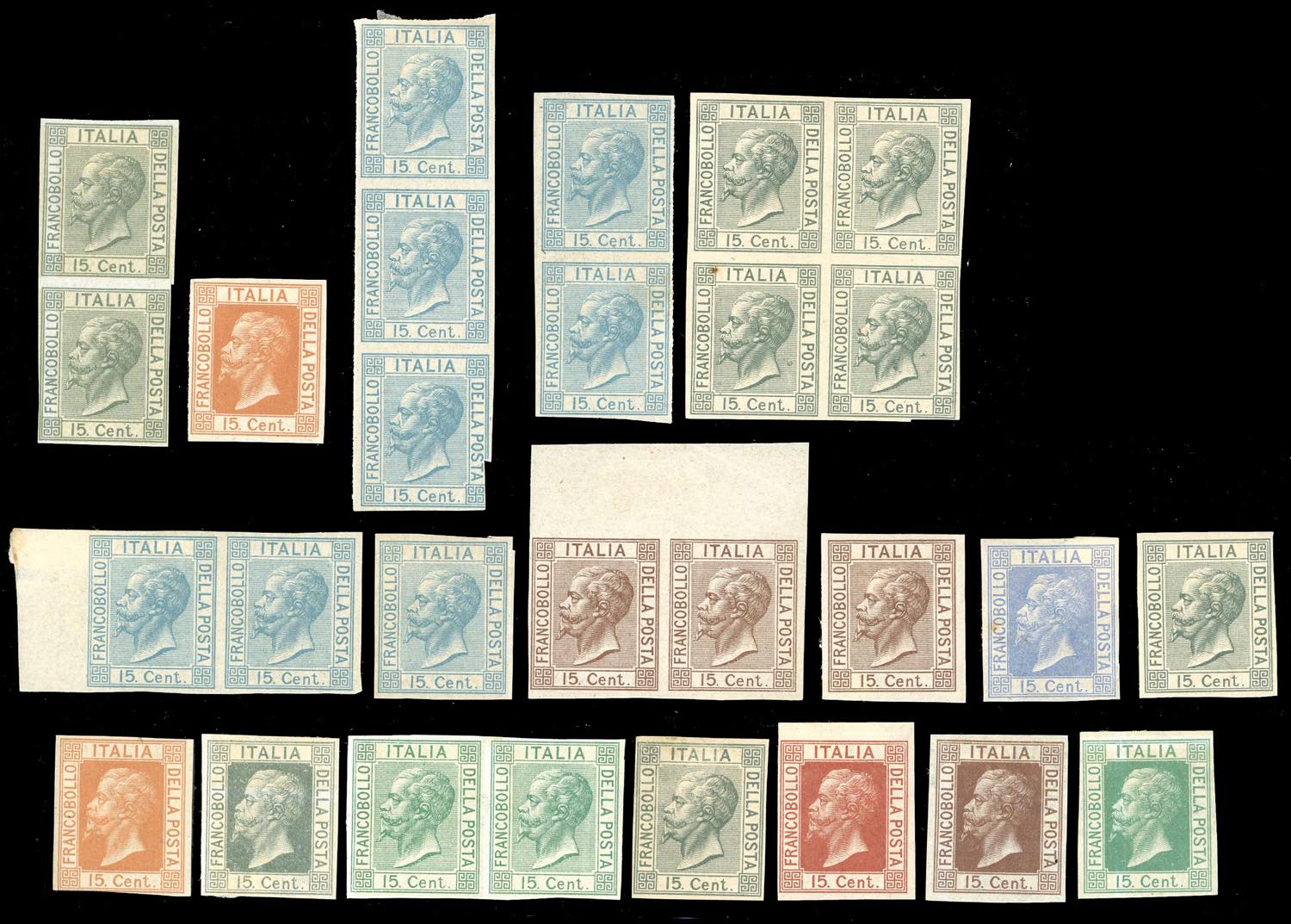REGNO D'ITALIA SAGGI 1864 - Lotto di 28 esemplari in diversi colori del saggio Bigola da 15 cent., linguellati, in parte fondo pieno, in parte fondo rigato. (cat.Unif. € 3.500).