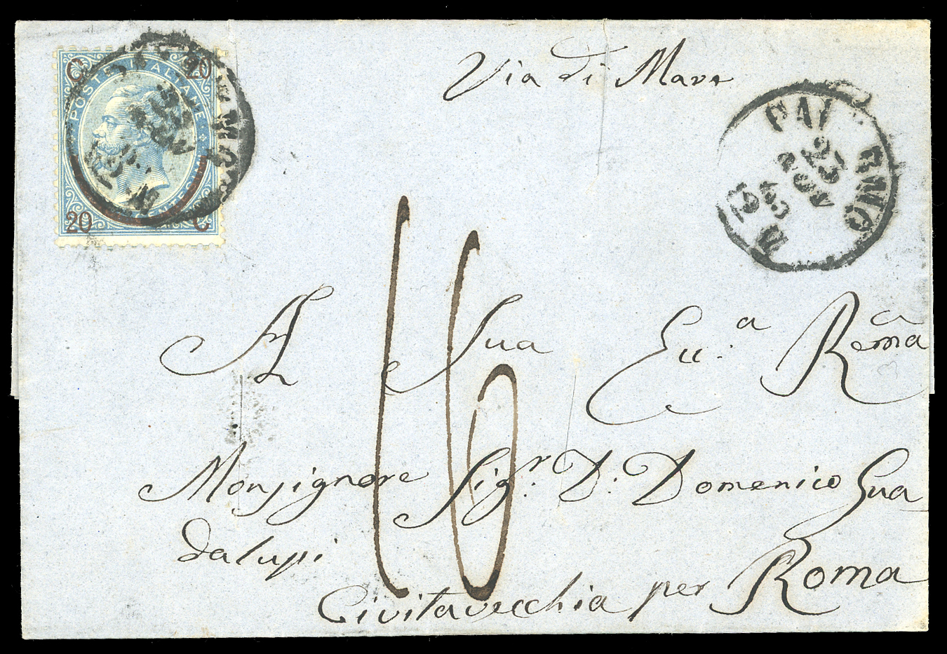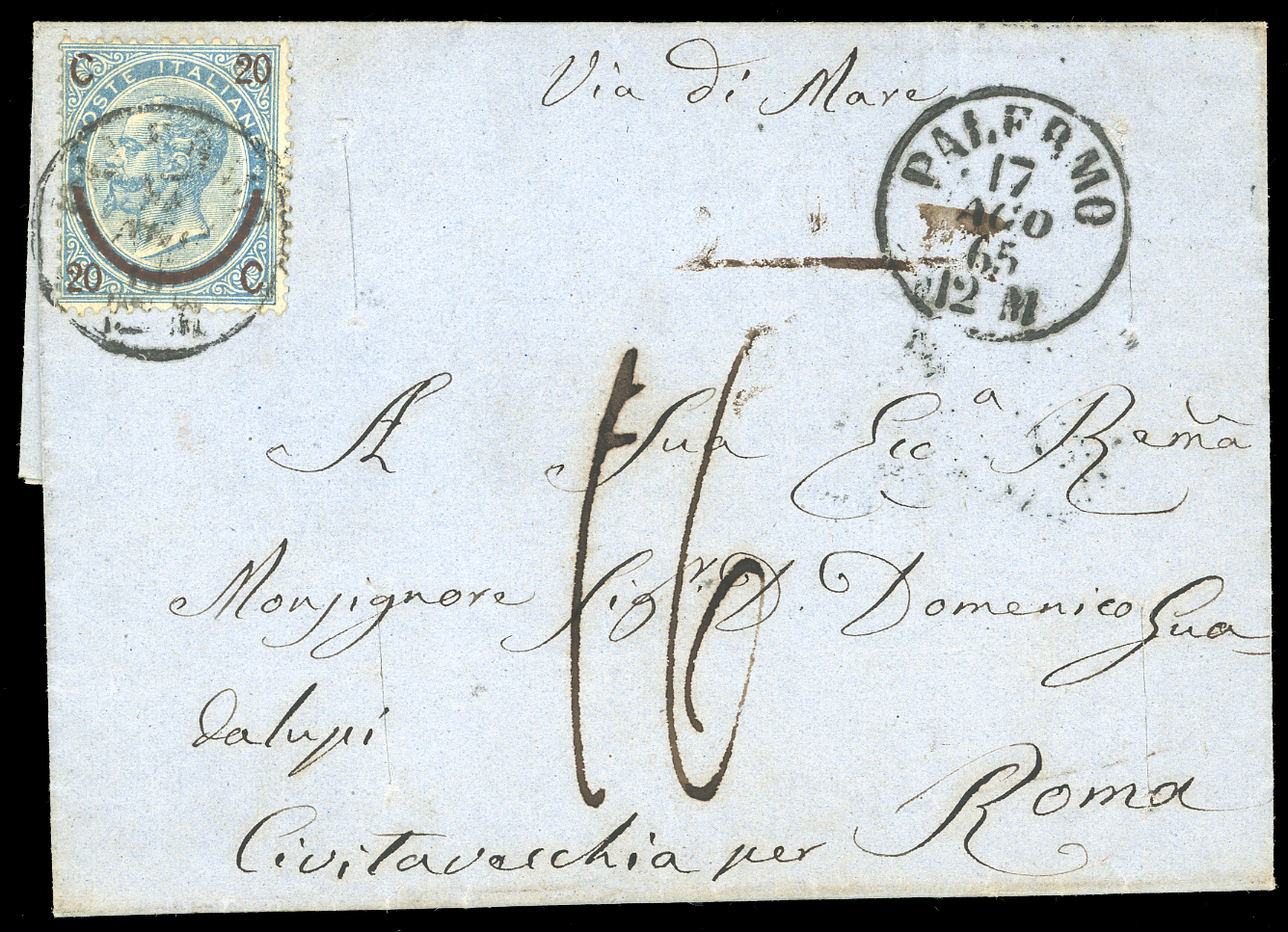 REGNO D'ITALIA SANITA' 1865 - Cinque lettere per lo Stato Ponitificio, quattro da Palermo a Roma "via di mare", tassate 16 baj e una di tre porti da Caltagirone a Roma, tassata 48 baj, tutte con tagli di disinfezione. Interessanti.