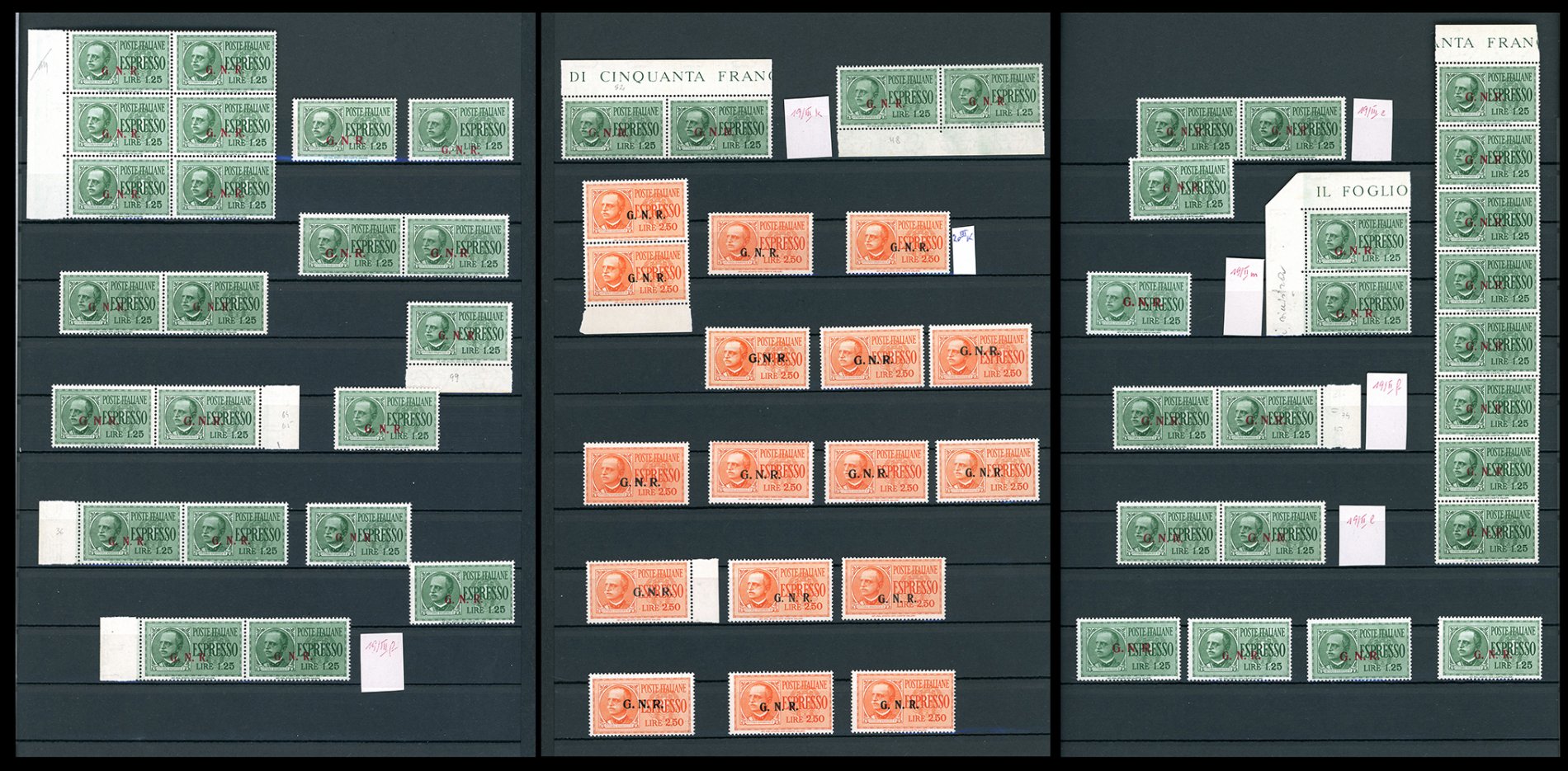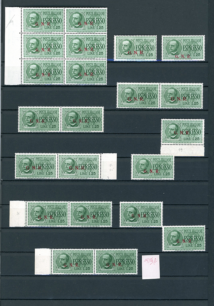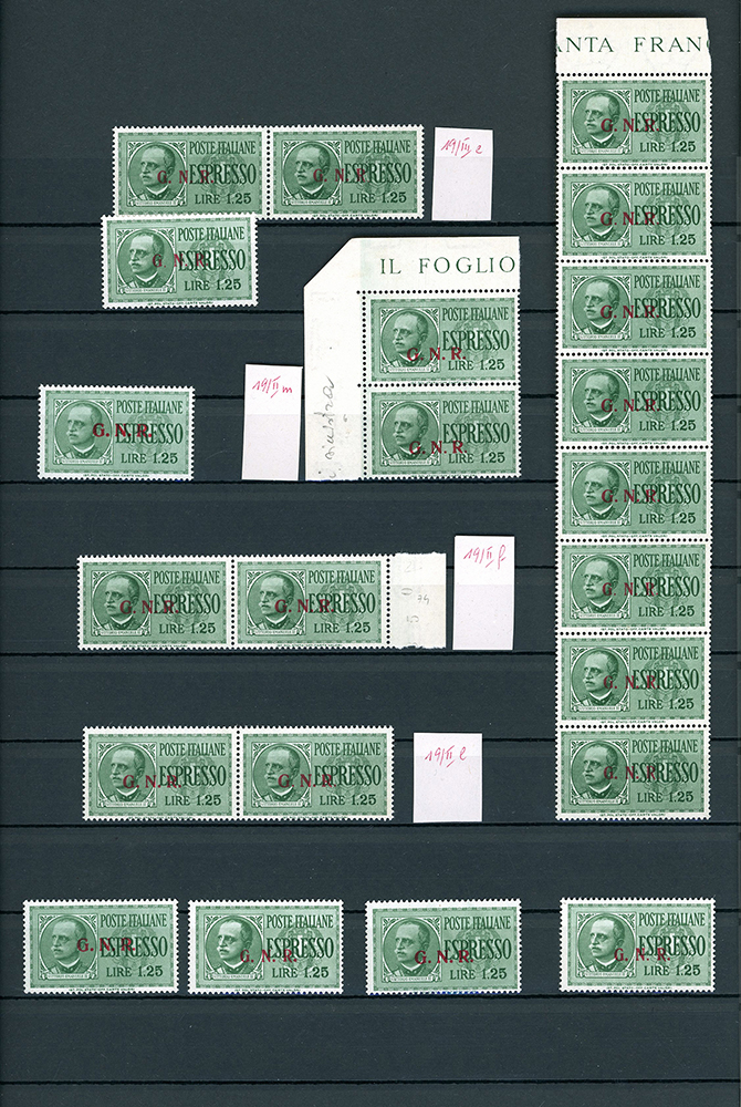 REPUBBLICA SOCIALE ITALIANA ESPRESSI 1943 - Soprastampati G.N.R., tiratura di Brescia (19/II-20/III), bella collezione di esemplari con varietà, anche di pregio. Ottima qualità generale, soprastampe garantite. Insieme di difficile reperibilità. Ex collezione Lemano.