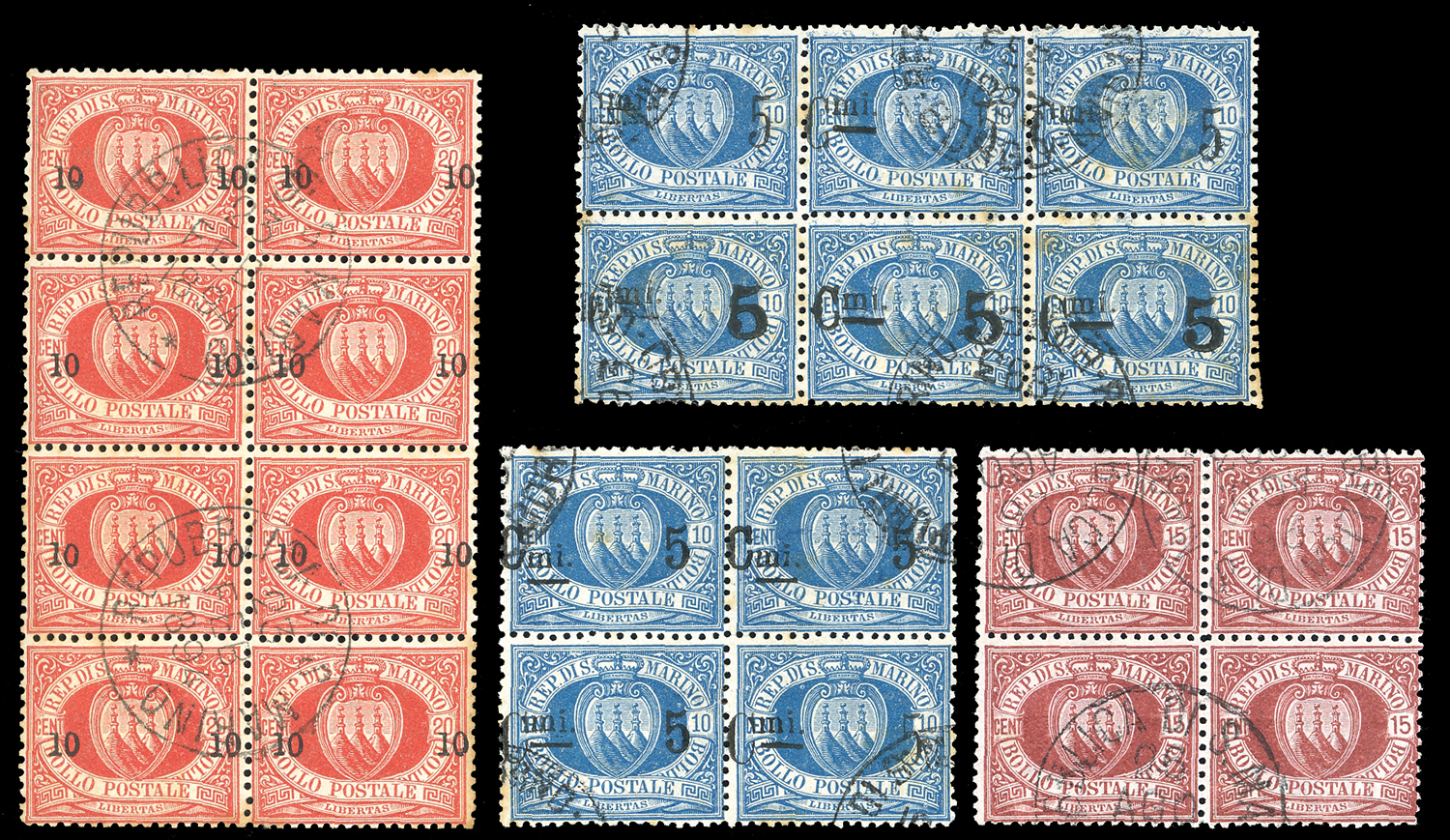 SAN MARINO 1892/1994 - 5 cent. Su 10 cent., un blocco di quattro e uno di sei, 10 cent. su 20 cent., blocco di otto, 15 cent., blocco di quattro (8,11,15), tutti usati, qualche ossidazione. Pregevole insieme.