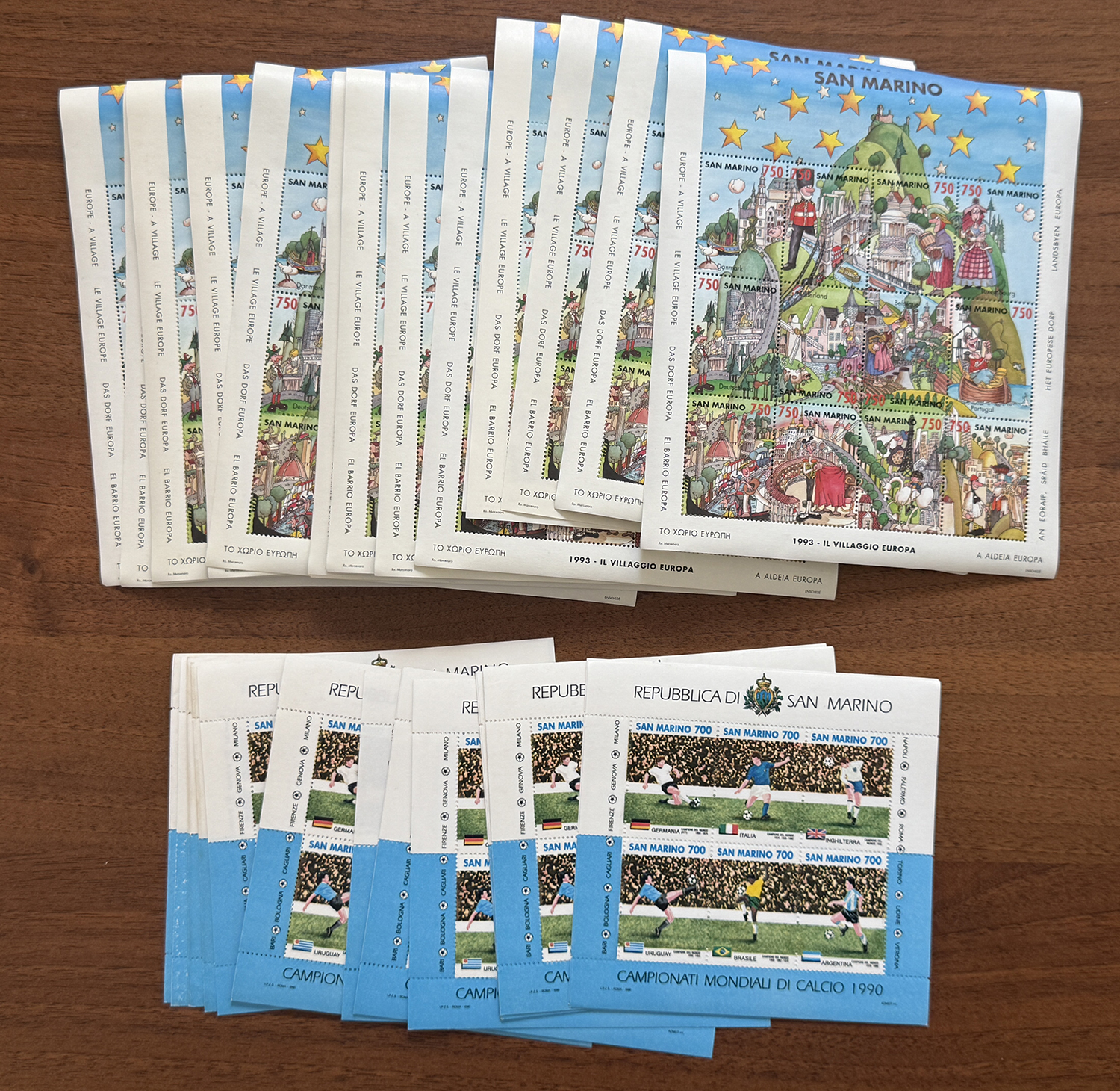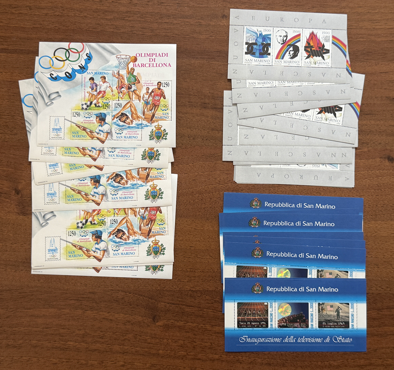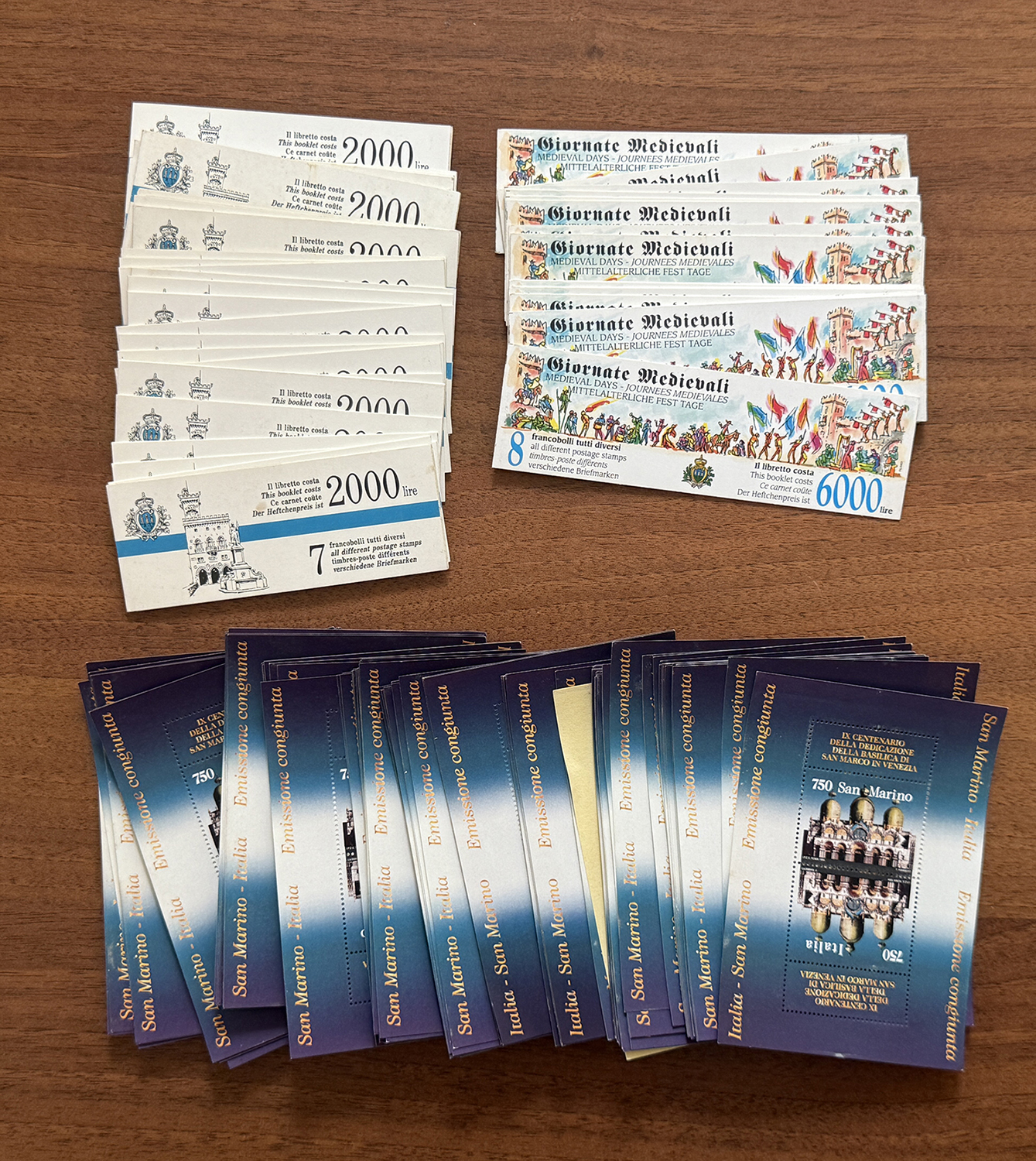 SAN MARINO FOGLIETTI/LIBRETTI 1989/1995 - Accumulazione di foglietti e libretti del periodo, anche molto ripetuti, in una scatola. Elevato valore facciale.