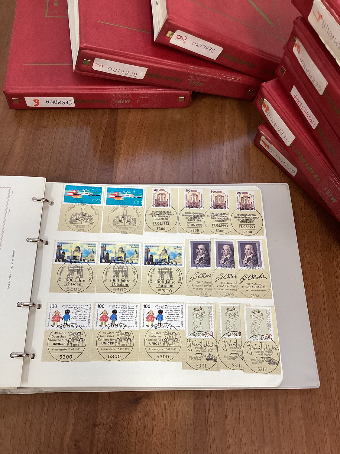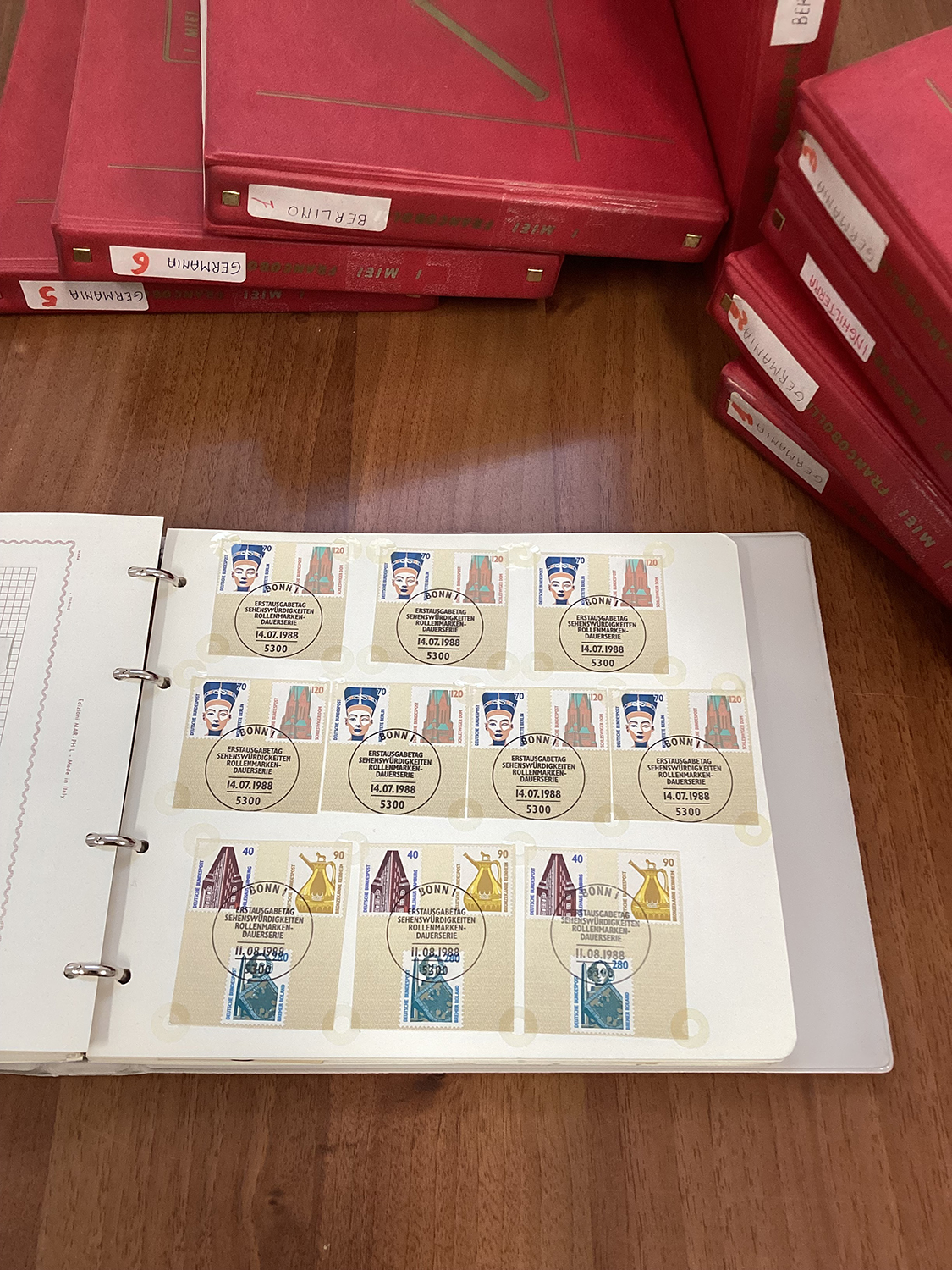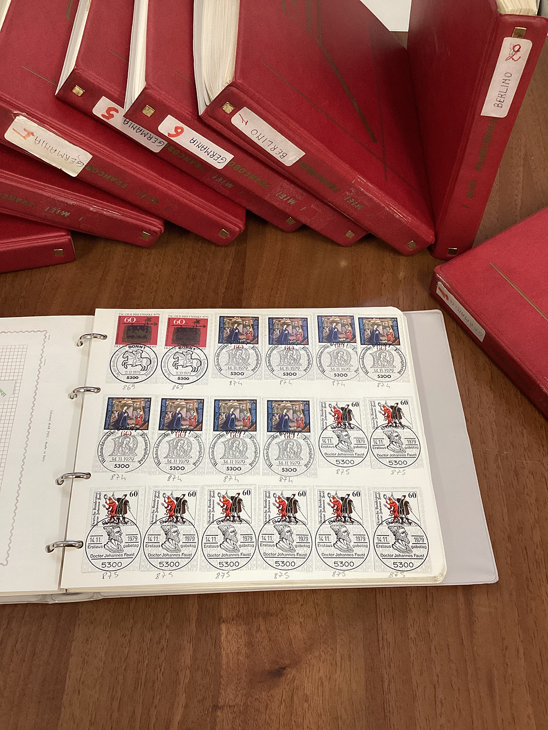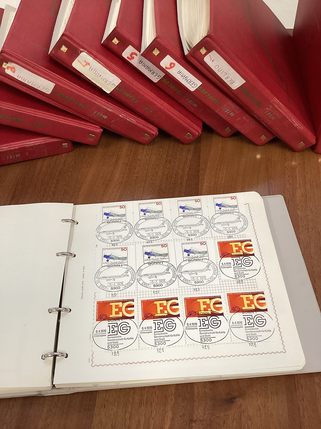 GERMANIA 1960/1985 - Otto raccoglitori con francobolli del periodo, ripetuti, su frammenti con annulli speciali FDC. Allegato un album con materiale comune di Gran Bretagna.