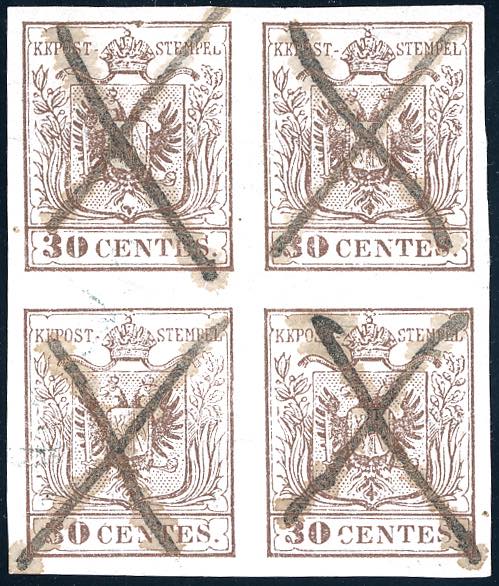 1850 - 30 cent. bruno chiaro, I tipo, carta a mano, prima tiratura (7a), blocco di quattro, perfetto e ben marginato, annullato con quattro segni di penna a forma di croce di Sant'Andrea. Il blocco proviene dal foglio inizialmente completo di 240 esemplari ora conservato al museo postale di Vienna. Si conoscono solo altri due blocchi di quattro ed un blocco di otto (tutti annullati con le croci di S.Andrea) in collezioni private. Importante rarità della I emissione, da esposizione. G.Oliva, Chiavarello, cert. Raybaudi.