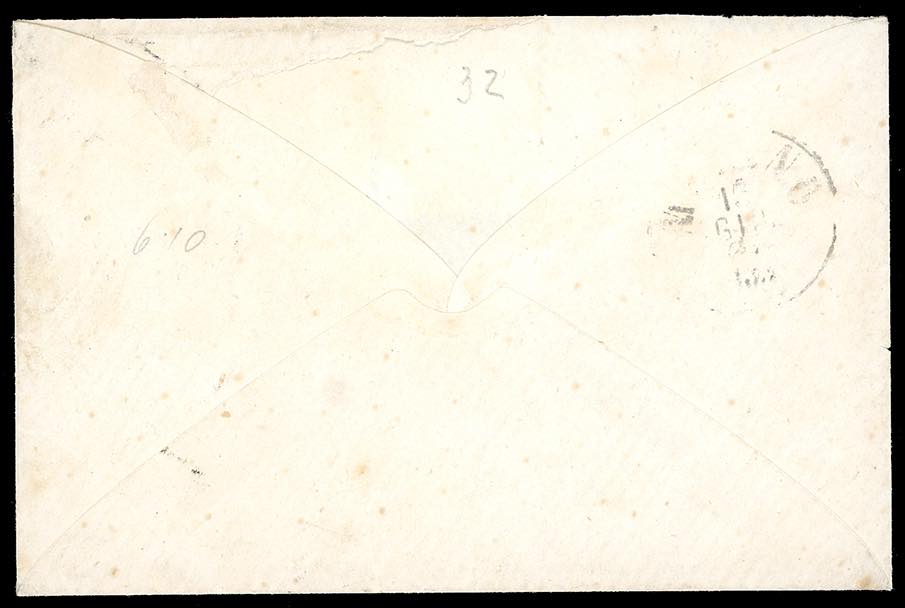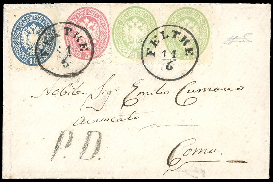 1865 - 3 soldi verde, due esemplari, 5 soldi rosa, 10 soldi azzurro, tutti dent. 9 1/2 (42,43,44), perfetti, su busta da Feltre 11/6/1865 a Como, bollo PD. Bella e rara affrancatura tricolore delle V emissione. Cert. Ferrario.