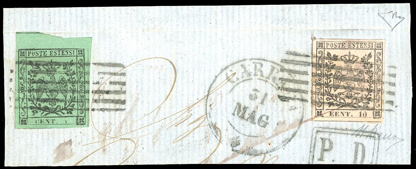 1852 - 10 cent. rosa chiaro, errore tipografico "EENT.10", 5 cent. verde, cifra "5" evanescente, bordo di foglio, entrambi senza punto dopo le cifre (2c,1), perfetti, usati su ampio frammento a Carrara 31/5. Pregevole insieme di varietà, di ottima qualità. A.Diena, cert. E.Diena.