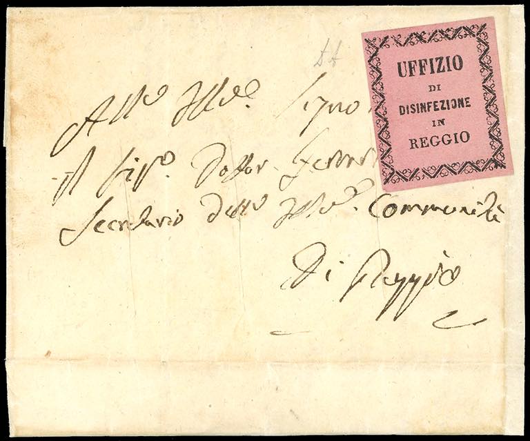 1855 - Lettera non affrancata da Modena (?) 17/7/1855 a Reggio, con tra tagli di disinfezione al centro e l'etichetta di sanità "Ufficio della disinfezione in Reggio" del II tipo secondo la catalogazione AISP. A.Diena.