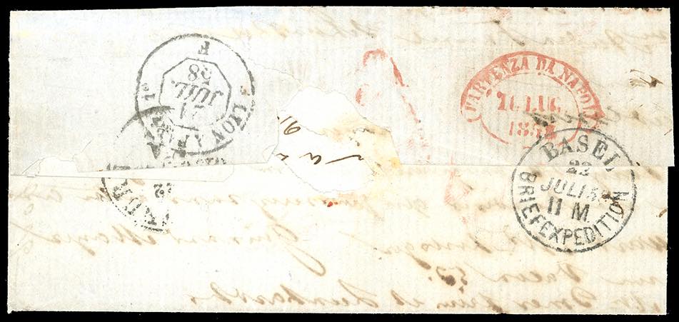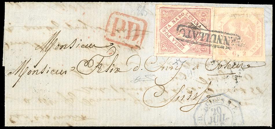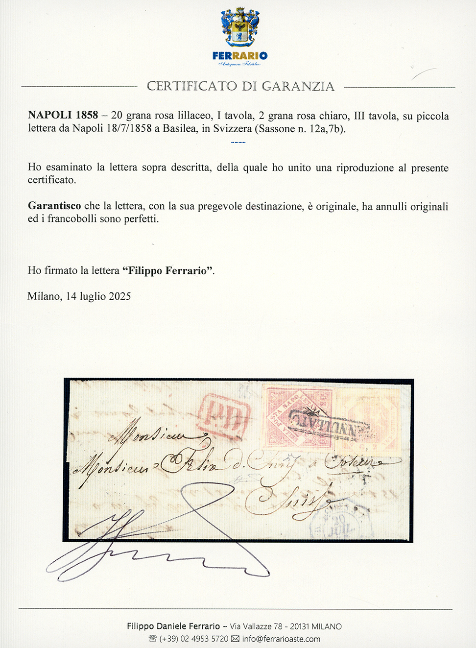 1858 - 20 grana rosa lillaceo, I tavola, 2 grana rosa chiaro, III tavola (12a,7b), perfetti, su piccola lettera da Napoli 18/7/1858 a Basilea, in Svizzera. Pregevole destinazione, impreziosita dall'eccezionale qualità del francobollo da 20 grana. Em.Diena, Chiavarello, cert. Ferrario.