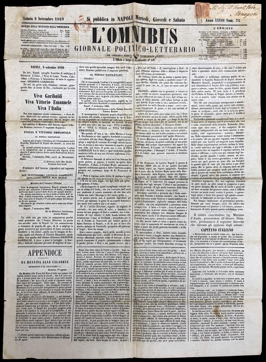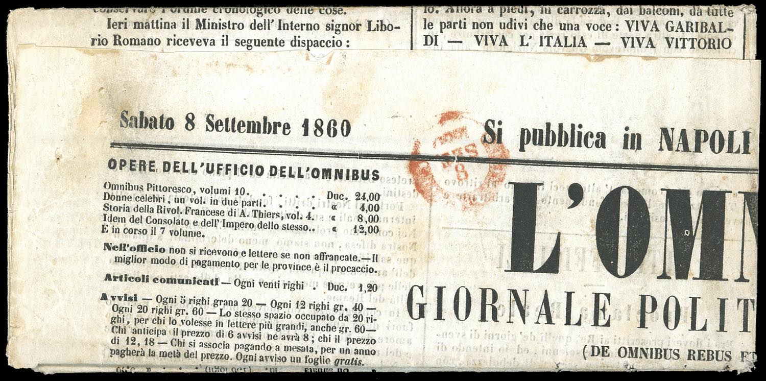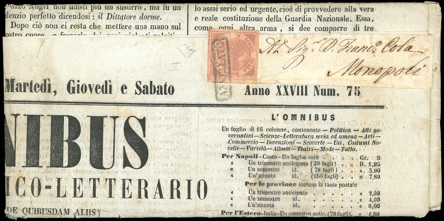 1860 - 1/2 grano rosa, II tavola (2c), perfetto, isolato su giornale completo "L'OMNIBUS" dell'8 settembre 1860, spedito in pari data da Napoli a Monopoli. Il giornale contiene la cronaca dell'entrata in Napoli di Giuseppe Garibaldi del giorno precedente e il testo di proclami pubblicati per l'occasione. Molto raro e di eccezionale interesse storico postale. Cert. Enzo Diena.