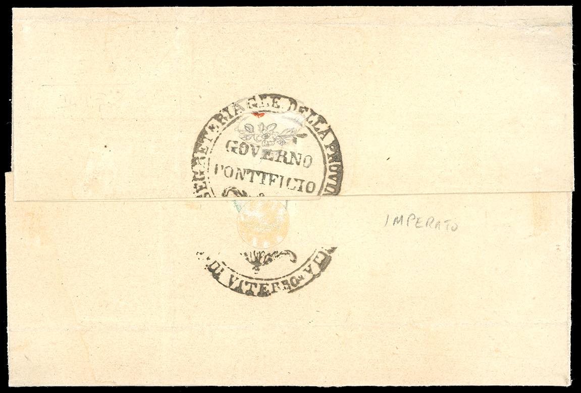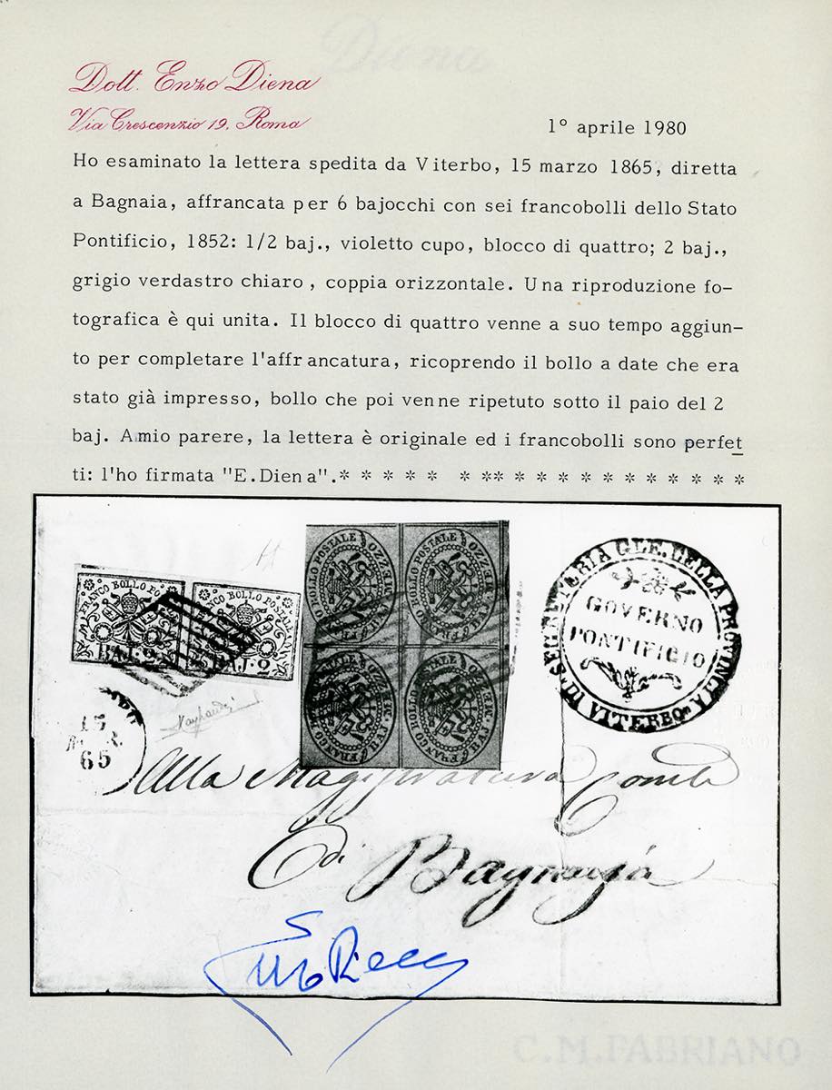 1865 - 1/2 baj violetto cupo, blocco di quattro, 2 baj grigio azzurrastro, coppia, il primo esemplare con spazio tipografico in alto (1Ab,3Ab), perfetti, su lettera da Viterbo 15/3/1865 a Bagnaia. Il blocco di quattro venne a suo tempo aggiunto per completare l'affrancatura, ricoprendo il bollo a data già impresso, datario che venne poi ripetuto a lato. Affrancatura scenografica e blocco di questa tinta estremamente raro su lettera. A.Diena, Raybaudi, cert. Enzo Diena e Ferrario.