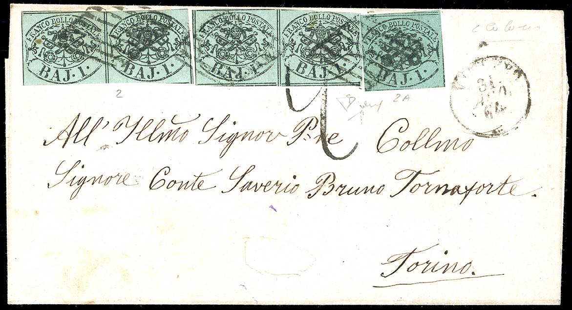 1864 - 1 baj verde grigiastro, due coppie, 1 baj verde scuro, I composizione (2,2A), su fresca lettera da Viterbo 31/8/1864 a Torino, tassata 20 cent. Bella e non comune combinazione di valori gemelli. E.Diena, Chiavarello. Ex coll. Imperato.