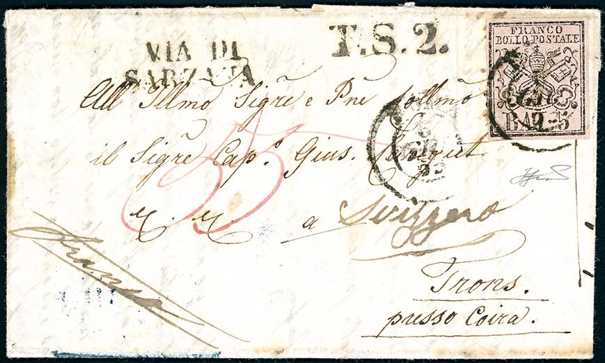 1853 - 5 baj rosa chiaro (6), perfetto, su lettera da Roma da 6/6/1853 a Trans, vicino a Chur, Svizzera, sul fronte i bolli "via di Sarzana" e "T.S.Z" e la tassa elvetica. Non comune. Ferrario.
