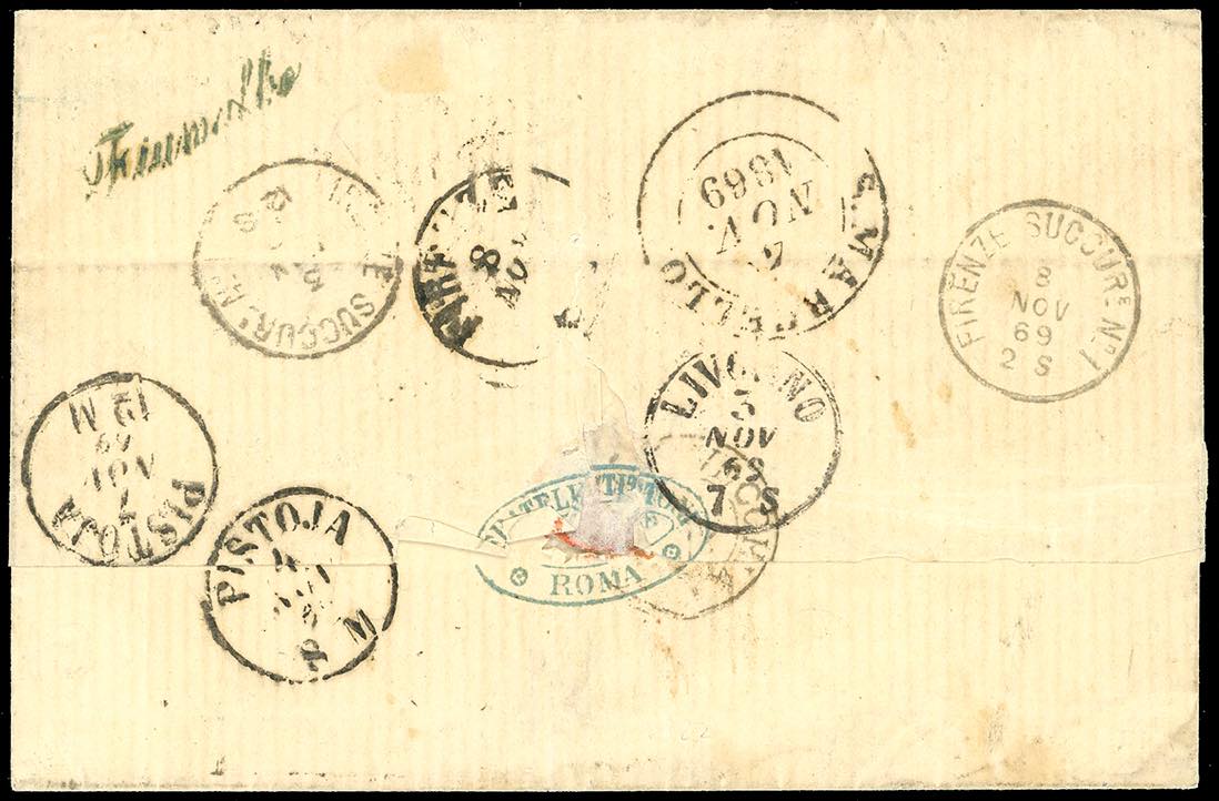 1860 - 20 cent. lilla rosa (28e), perfetto, su lettera da Roma 3/11/1869 indirizzata inizialmente a San Marcello Pistoiese, successivamente rispedita a Fiumalbo, lineare di collettoria al verso. Venne quindi rispedita, previa nuova affrancatura con 20 cent. azzurro, tiratura di Torino (T26), da Pievelago, che annullò il francobollo con il muto a rombi "1729", a Firenze e poi ancora nello Stato Pontificio a Tolfa, che dipendeva da Civitavecchia. Pregevole affrancatura mista di rispedizione, impreziosita dai numerosi inoltri. Colla, cert. Bolaffi.