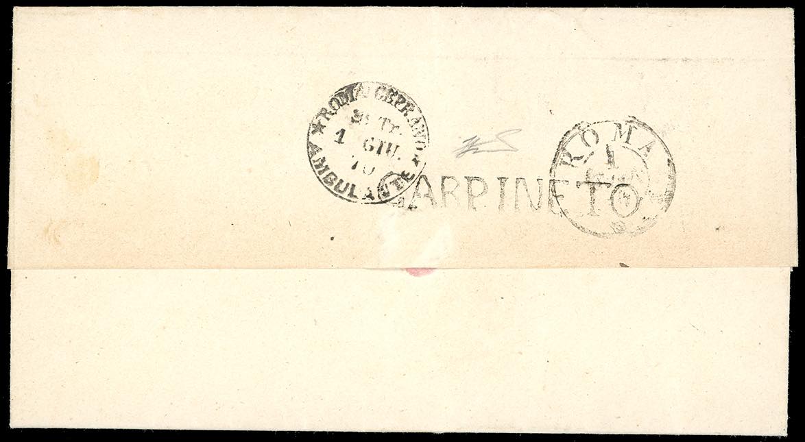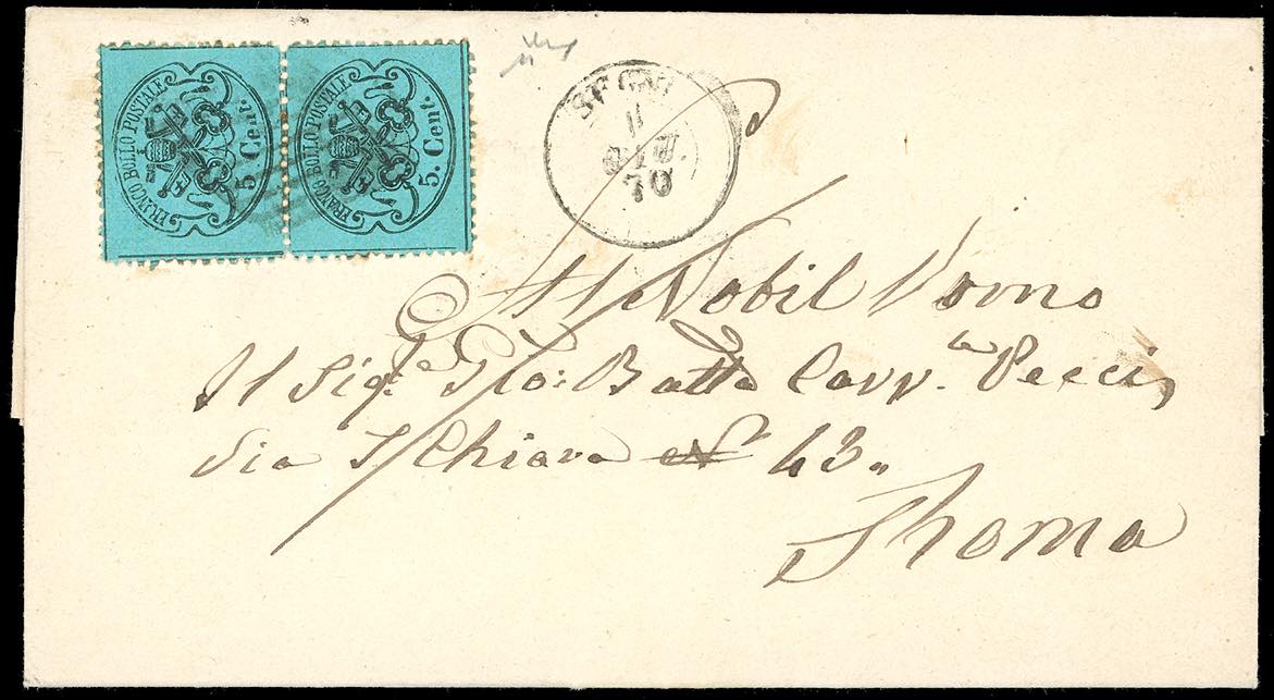 CARPINETO, SD punti 12 - 5 cent. (25), coppia verticale, perfetta, su fresca lettera del 31/5/1870, transito di Segni del giorno successivo ... Read more