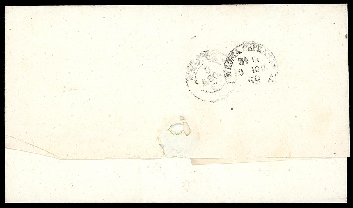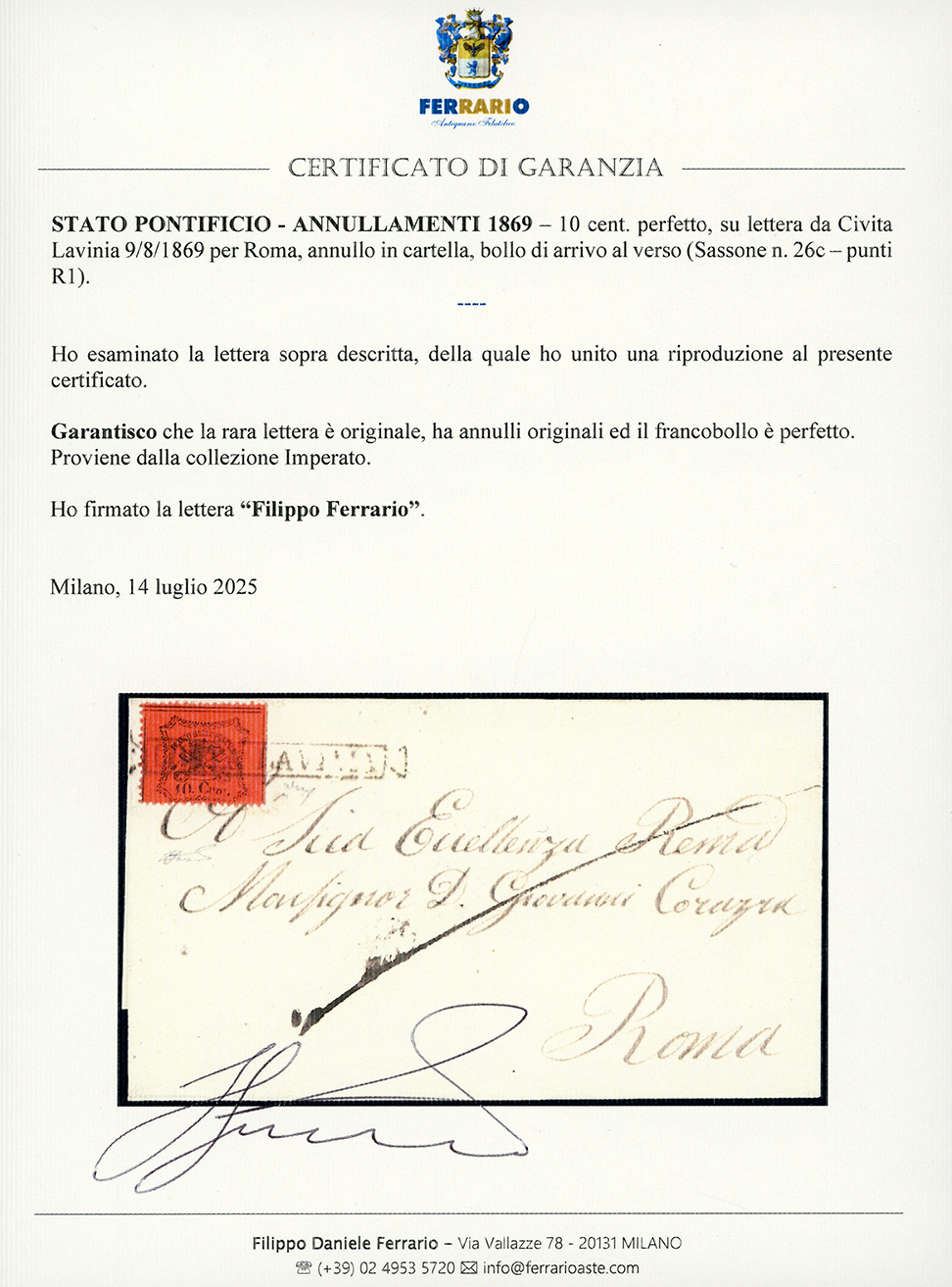 CIVITA LAVINIA, Cart. Punti R1 - 10 cent. (26c), perfetto, su fresca lettera per Roma 9/8/1869, bollo di arrivo al verso. Splendida e rara. Chiavarello, cert. Ferrario.