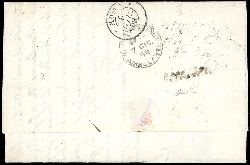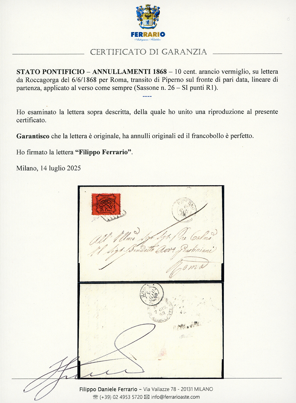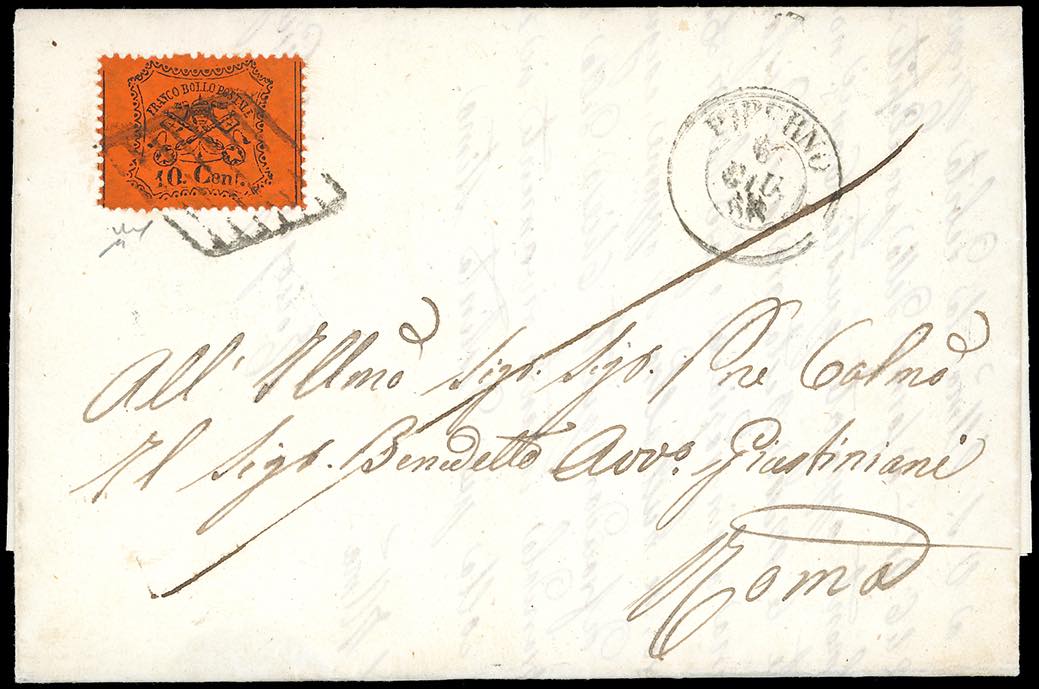 ROCCAGORGA, SI punti R1 - 10 cent. (26), perfetto, su fresca lettera del 6/6/1868, transito di Piperno sul fronte di pari data, per Roma. Raro lineare di partenza, applicato al verso come sempre. Chiavarello, cert. Ferrario.