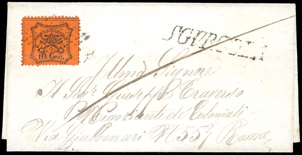 SGURGOLA, SI punti 13 - 10 cent. (26c), lieve piega orizzontale, su fresca lettera del 6/2/1869 per Roma. Rara, ottimo aspetto. Chiavarello.