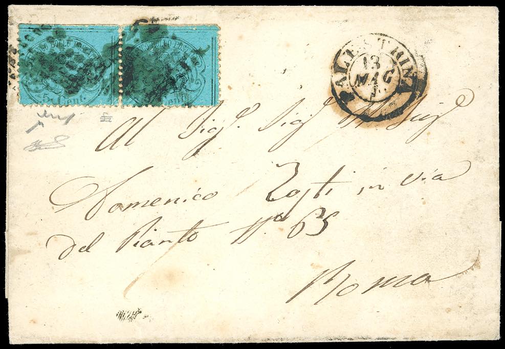 ZAGAROLO, O azzurro punti 13 - 5 cent. (25), coppia, perfetta, su lettera del 12/5/1870, transito di Palestrina sul fronte del giorno ... Read more