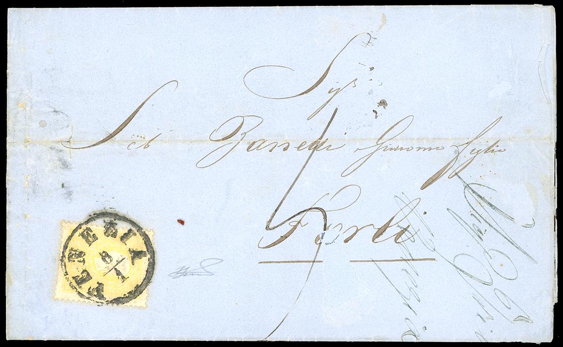 INCOMING MAIL LOMBARDO VENETO 1860 - 2 soldi giallo, II tipo (28), perfetto, isolato su circolare a stampa da Venezia 8/1/1860 a Forlì, ... Read more