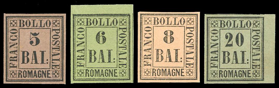 1859 - Serie completa (1/9), diversi esemplari bordo di foglio, gomma originale integra, leggerissima traccia di linguella per il 4 e il 20 baj, perfetti e molto freschi. Ottima qualità. Cert. Finanziario Bolaffi 100%.