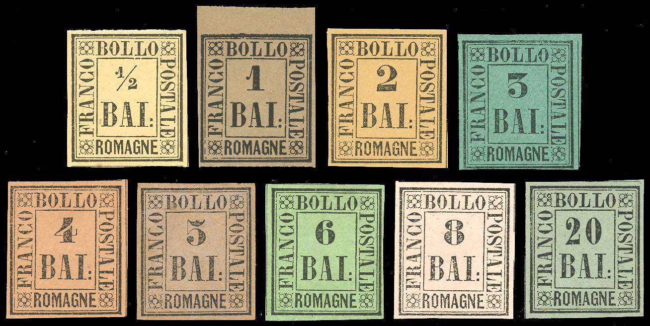 1859 - Serie completa (1/9), nuovi, gomma originale per i n. 3, 4, 5, 6, 9, integra per i n. 1 e 2, i n. 7 e 8 senza gomma, perfetti. Tutti firmati da noti periti, cert. Bolaffi per il 4 baj.