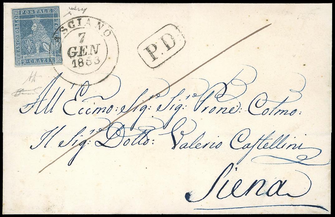 1853 - 2 crazie azzurro chiaro su grigio (5), evidente pli d'accordeon orizzontale, perfetto, su fresca lettera da Asciano 7/1/1853 a Siena. Splendida e rara. A.Diena, Chiavarello, Ferrario.