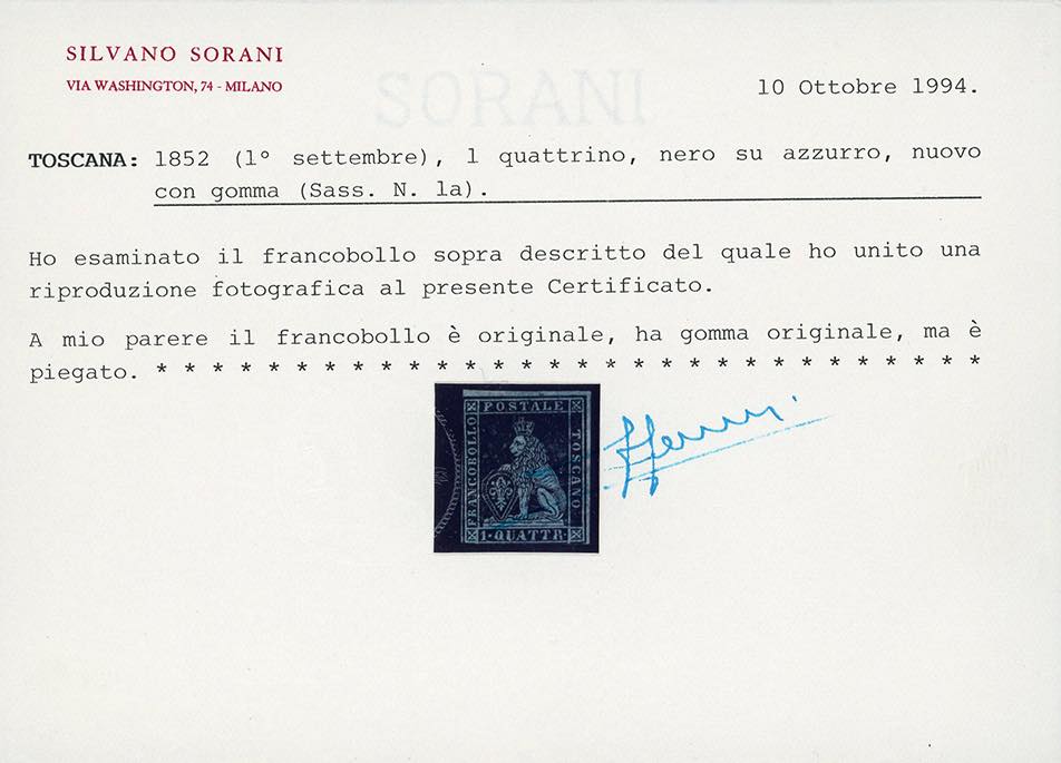 1851 - 1 quattrino nero su carta azzurra, I emissione (1a), nuovo, gomma originale, lieve piega orizzontale non detrurpante, molto fresco. ... Read more