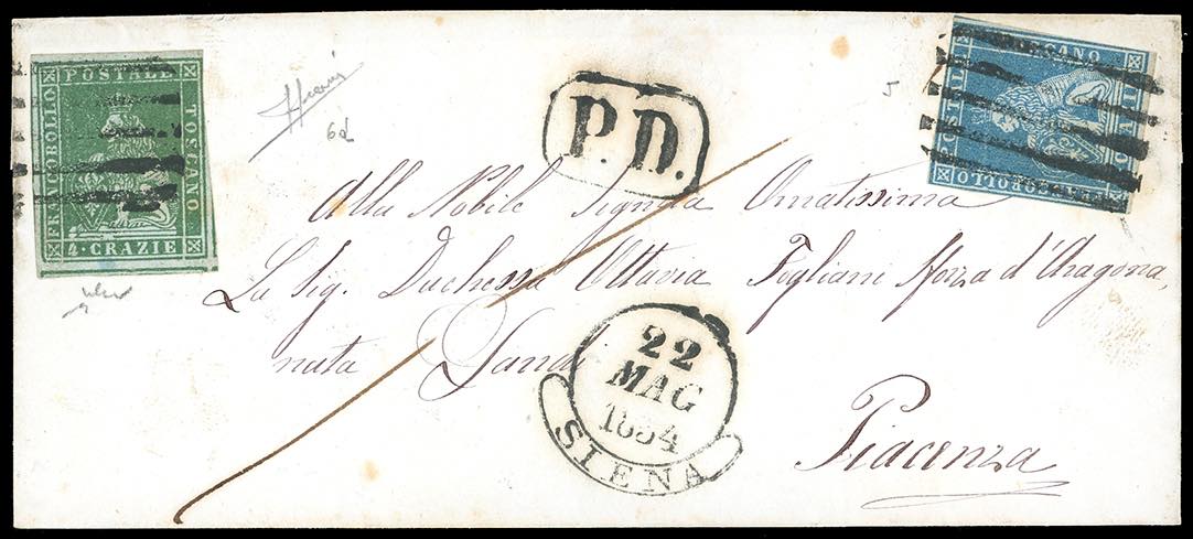 1854 - 4 crazie verde giallo scuro, 2 crazie azzurro, entrambi su carta grigia (6d,5d), margini da ampi a leggermente intaccati, su fresca lettera da Siena 22/5/1854 a Piacenza, nel Ducato di Parma. Ottimo aspetto. Sorani, Chiavarello.