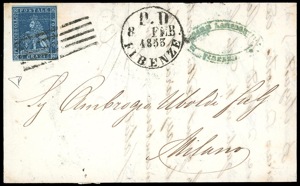1853 - 6 crazie azzurro scuro su carta azzurra (7c), perfetto, su fresca lettera da Firenze 8/2/1853 a Milano. Molto bella. Cert. E.Diena.