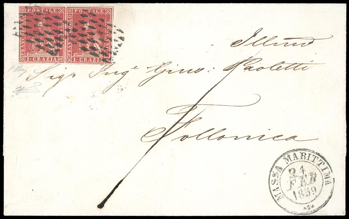 1859 - 1 crazia carminio, II emissione (12), coppia perfetta e ben marginata, su fresca lettera da Massa Marittima 24/2/1859 a Follonica. Splendida. G.Oliva, cert. Ferrario.