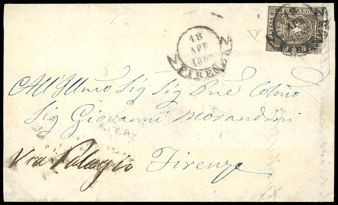 1860 - 10 cent. bruno (19), perfetto e ben marginato, isolato su lettera di doppio porto da Firenze 18/4/1860 per città. Porto multiplo ... Read more