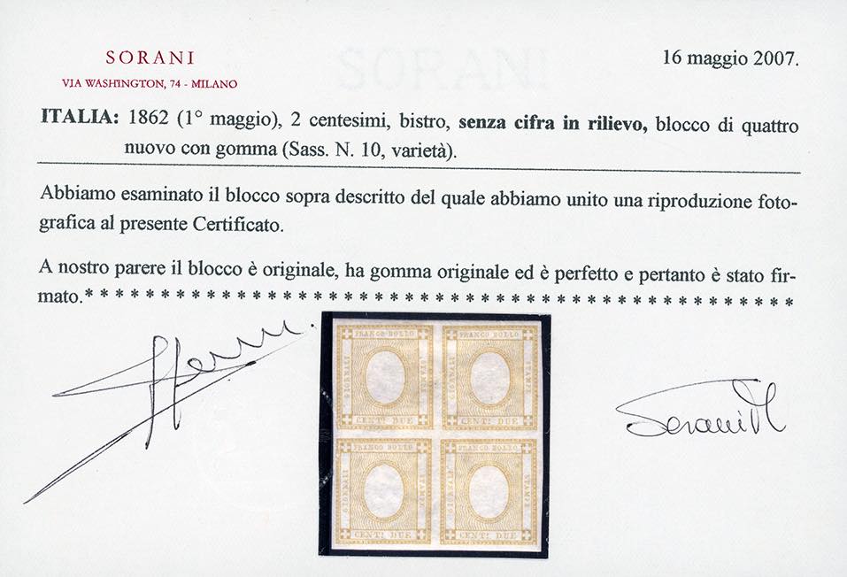 1862 - 2 cent. bistro, SENZA CIFRA IN RILIEVO (10eb), blocco di quattro, nuovo, gomma originale, perfetto e molto fresco. Molto raro con gomma e sottoquotato. Cert. Sorani.