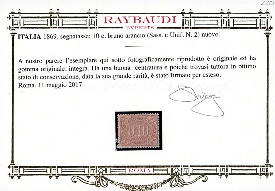 1869 - 10 cent. bruno arancio (2), nuovo, gomma originale integra, perfetto. Molto fresco, buona centratura. Raro di questa qualità. Fiecchi, Diena, cert. Ferrario e Oro Raybaudi.