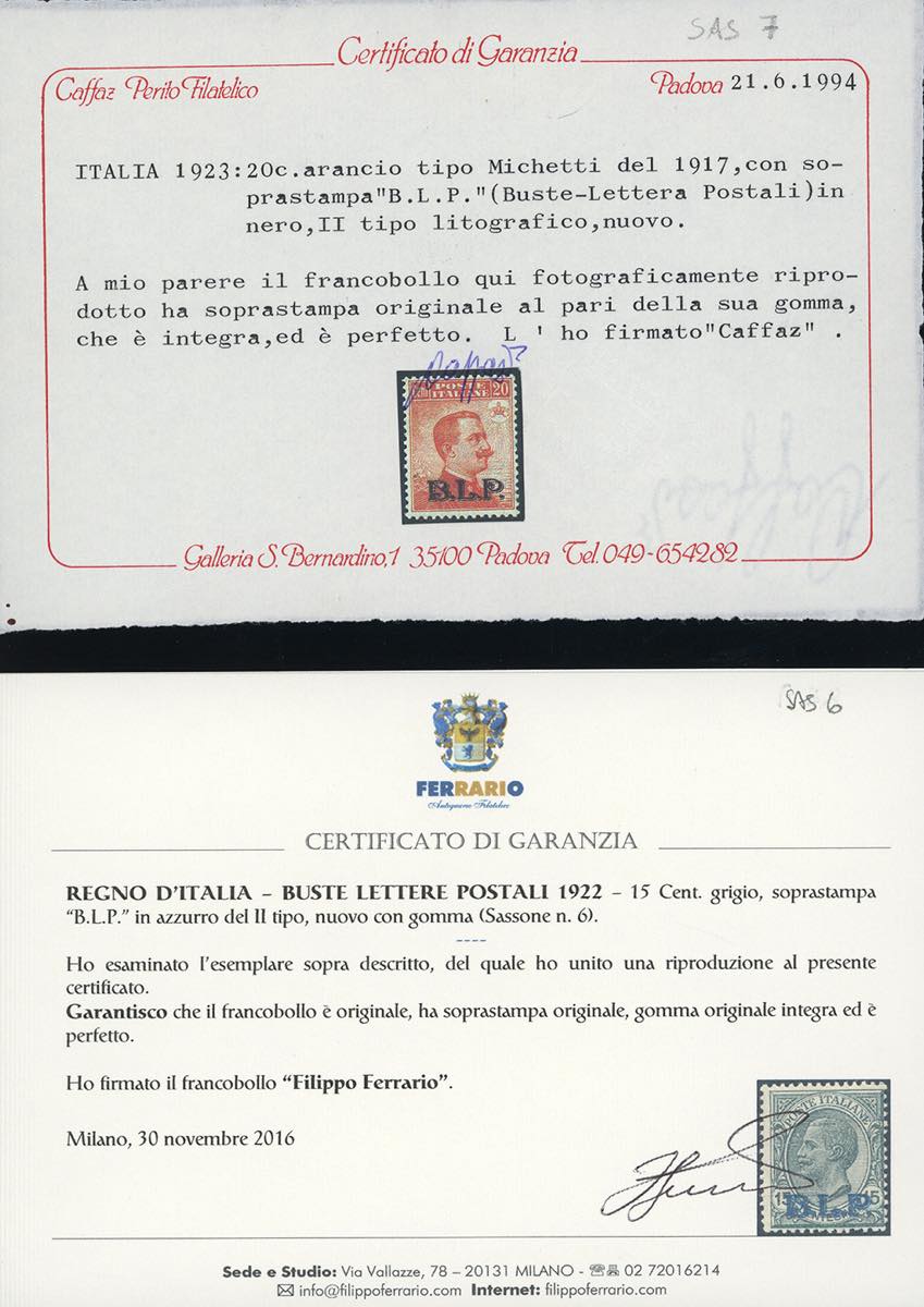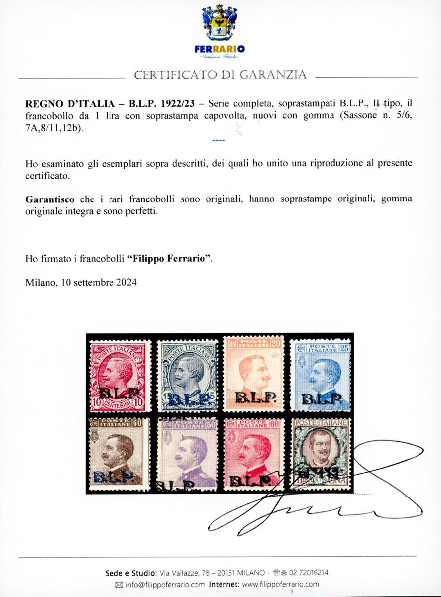 1922/23 - Soprastampa BLP, II tipo, serie completa, l'1 lira con soprastampa capovolta (5/6,7A,8/11,12b), gomma originale integra, perfetti. Raro insieme di ottima qualità. Ferrario per la serie, sei certificati di noti periti per i valori più importanti.