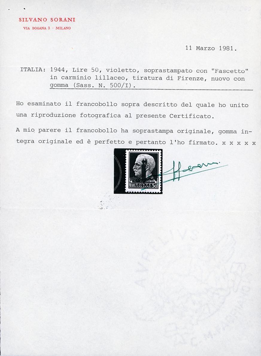 1944 - 50 lire soprastampa fascio in carminio lillaceo, tiratura di Firenze (500/I), gomma originale integra, perfetto. Raro e di ottima qualità. Fiecchi, Carraro, cert. Sorani.