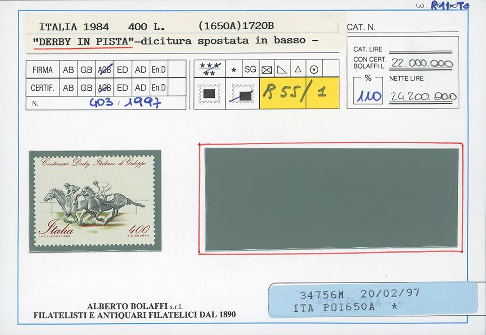 1984 - 400 lire Derby in pista, dentellatura orizzontale fortemente spostata in basso, francobollo naturale (Sassone 1684a,Bolaffi 1794B punti 240), bordo di foglio, nuovo, gomma originale integra, perfetto. Raro e di ottima qualità. Cert. Finanziario Bolaffi 110%.