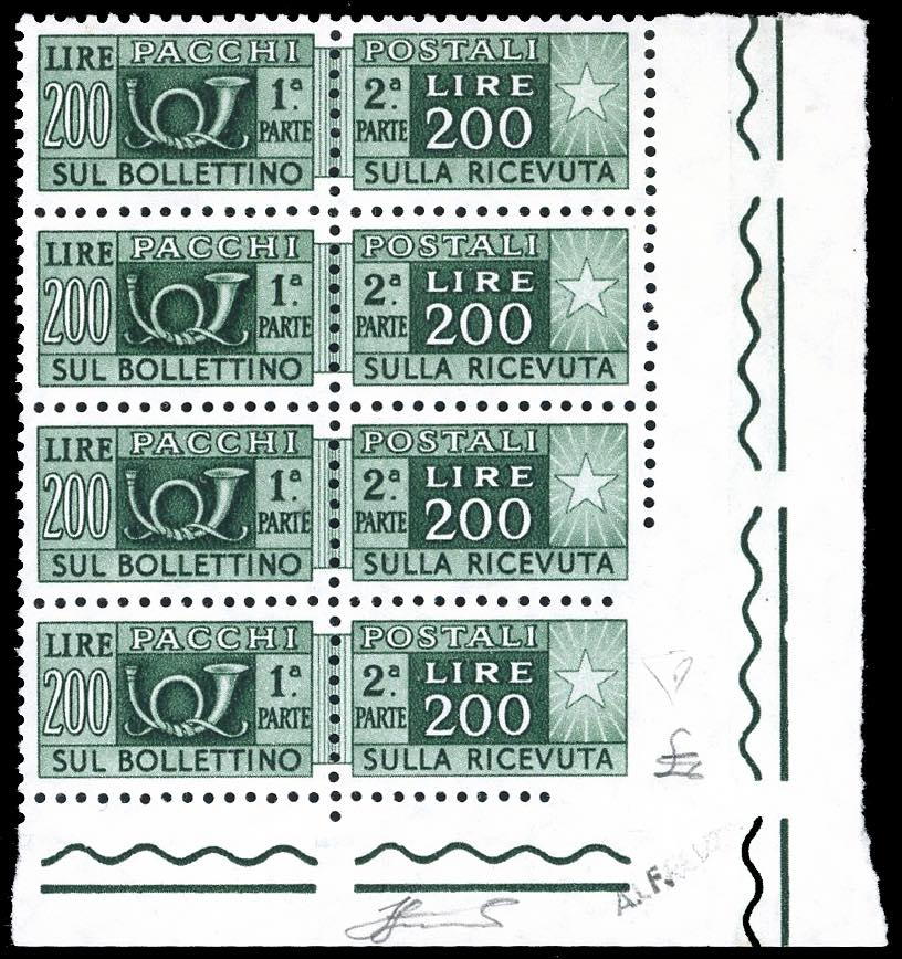 PACCHI POSTALI 1955 - 200 lire, filigrana stelle del II tipo, striscia verticale di quattro, l'ultimo esemplare non dentellato a destra, quello superiore con dentellatura parziale (94/Iii), angolo di foglio, nuova, gomma originale integra, perfetta. Varietà molto rara. Ferrario, E.Diena, L.Gazzi.