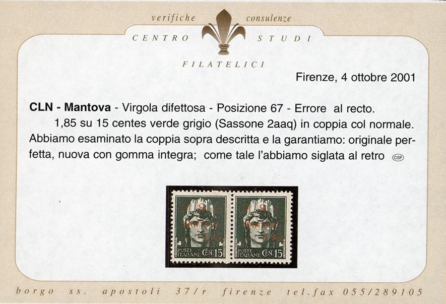 MANTOVA 1945 - 1,85 lire su 15 cent., soprastampa recto-verso, al recto punto piccolo dopo la "I" e virgola quasi invisibile, in coppia con il normale (2aaq,2aa), gomma originale integra, perfetta. Cert. Centro Studi Filatelici Firenze.