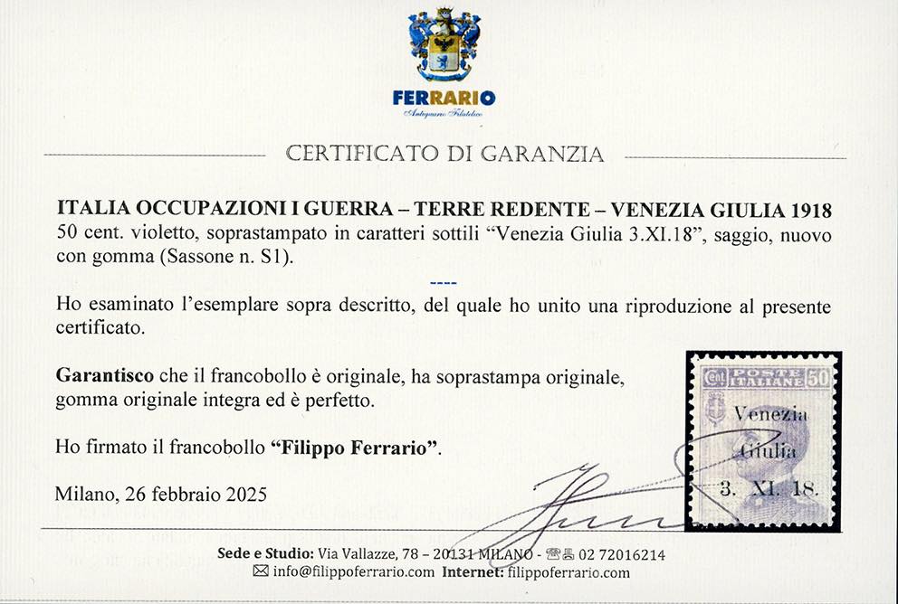 VENEZIA GIULIA 1918 - 50 cent. soprastampa in caratteri sottili, saggio (S1), perfetto, gomma originale integra. Raro, tiratura 200 ... Read more