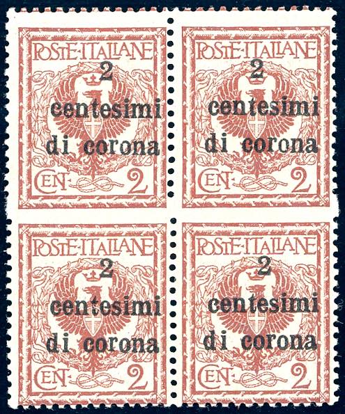 Lot 463 - TRENTO E TRIESTE 1919 - 2 cent. su 2 cent., blocco di ...