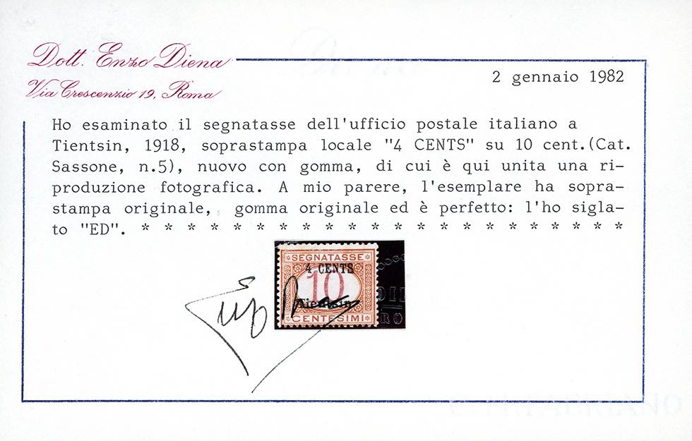 TIENTSIN SEGNATASSE 1918 - 4 cent. su 10 cent. soprastampato (5), nuovo, gomma originale, lievissima traccia di linguella, perfetto. Molto ... Read more