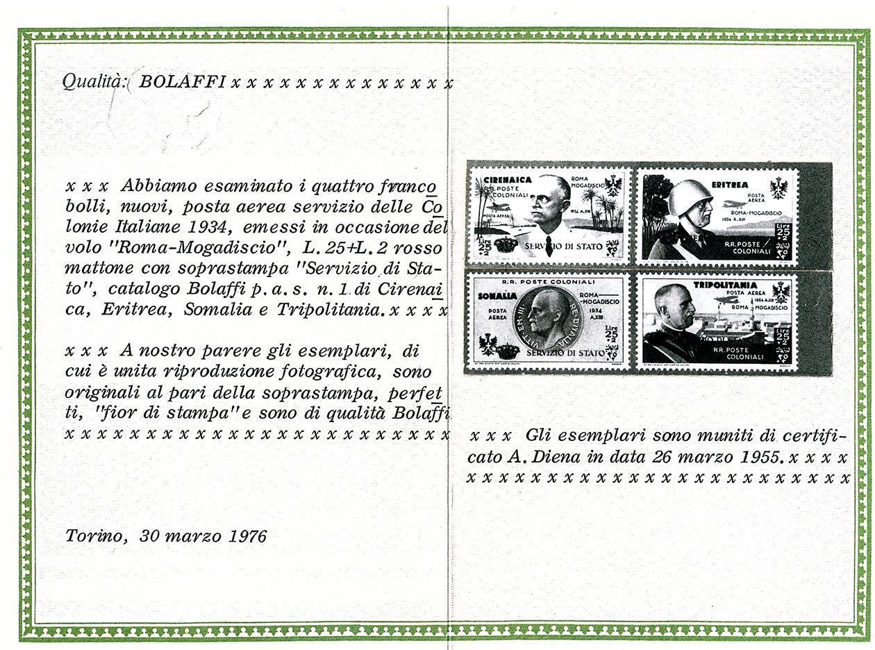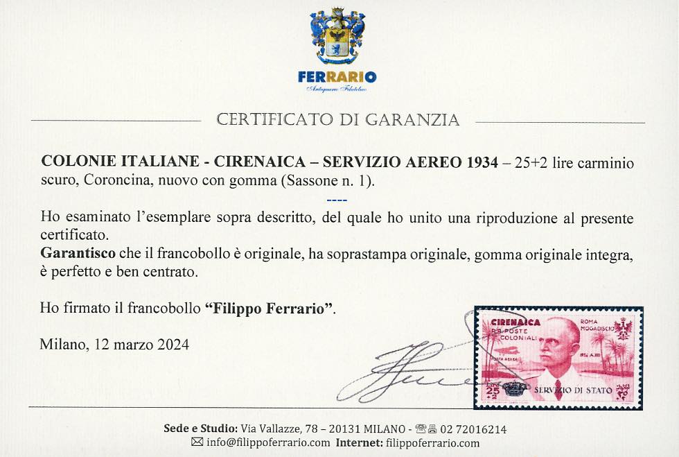 SERVIZIO AEREO 1934 - 25 + 2 lire Coroncina (1), gomma originale integra, perfetto, ottima qualità. Fotocopia cert. Bolaffi, cert. ... Read more