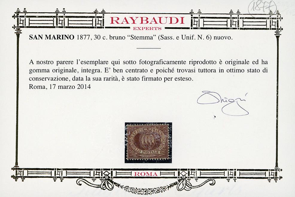 1877 - 30 cent. bruno Stemma (6), ottima centratura, nuovo, gomma originale integra, perfetto. Molto bello, raro in queste condizioni qualitative. Cert. Oro Raybaudi.