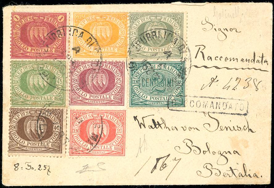 1893 - Bella affrancatura "otto colori", comprendente 1 lira carminio su giallo Stemma (1,4,5,13,16,17,18,20), perfetti, su busta raccomandata da San Marino 4/4/1893 a Bologna. Rara. A.Diena, Ferrario, Golinelli.