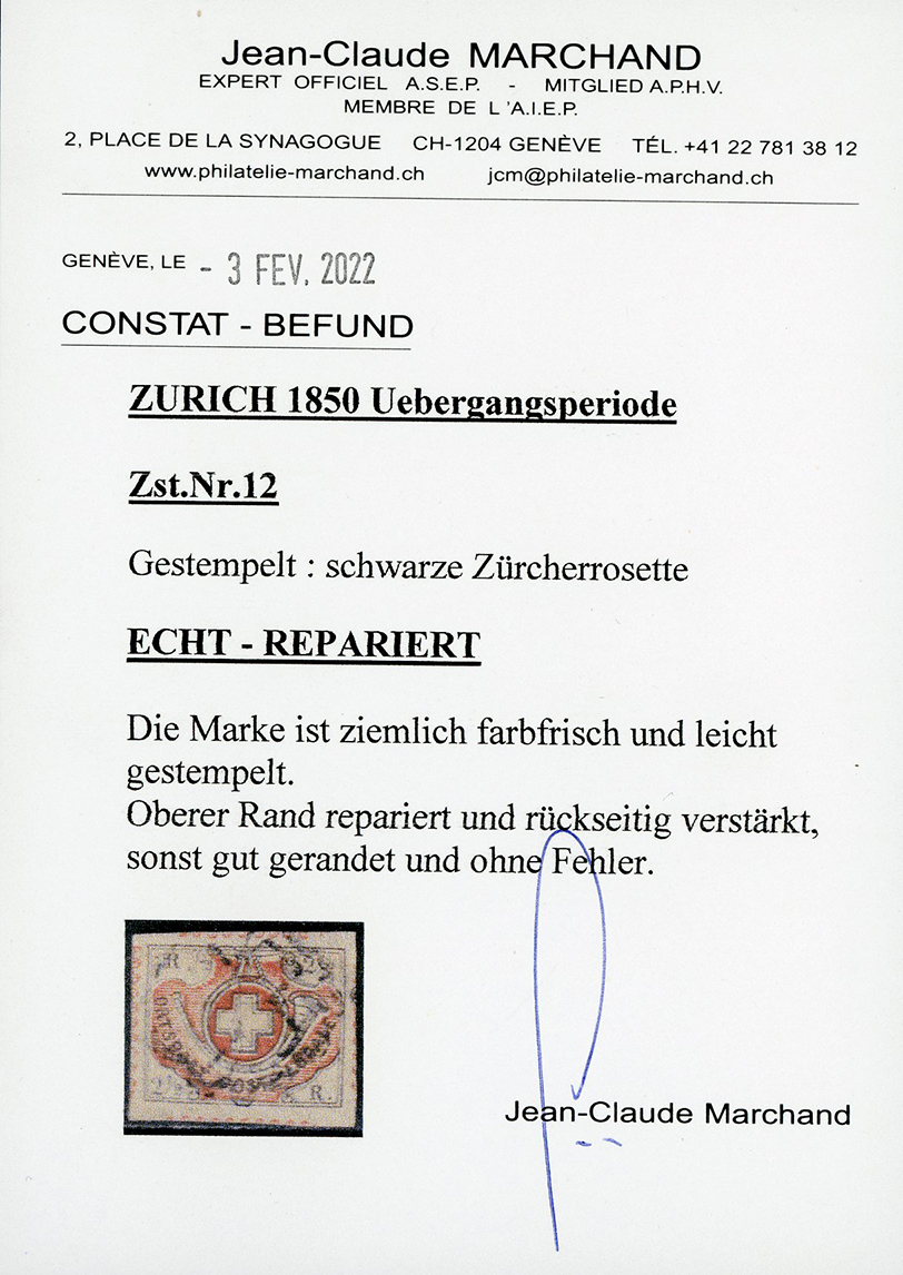 SVIZZERA CANTONALI ZURIGO 1850 - 2 1/2 r. Winterthur (11), usato, riparato in alto. Raro, ottimo aspetto. Cert. Marchand e Raybaudi.