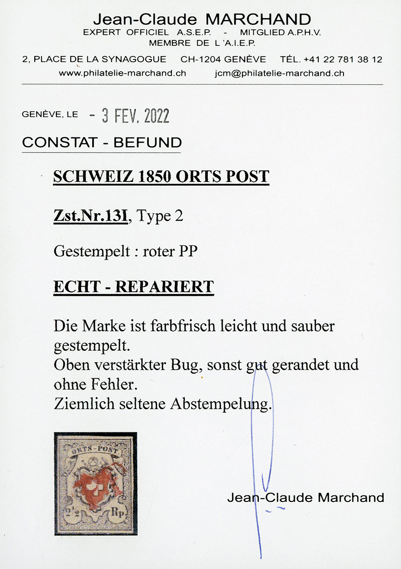 SVIZZERA POSTE FEDERALI 1850 - 2 1/2 r. Orts Post, croce inquadrata (17), piega orizzontale restaurata in alto, usato con il pregevole annullo PP in rosso. Ottimo aspetto. Cert. Marchand e A.Diena (che lo dichiara perfetto).