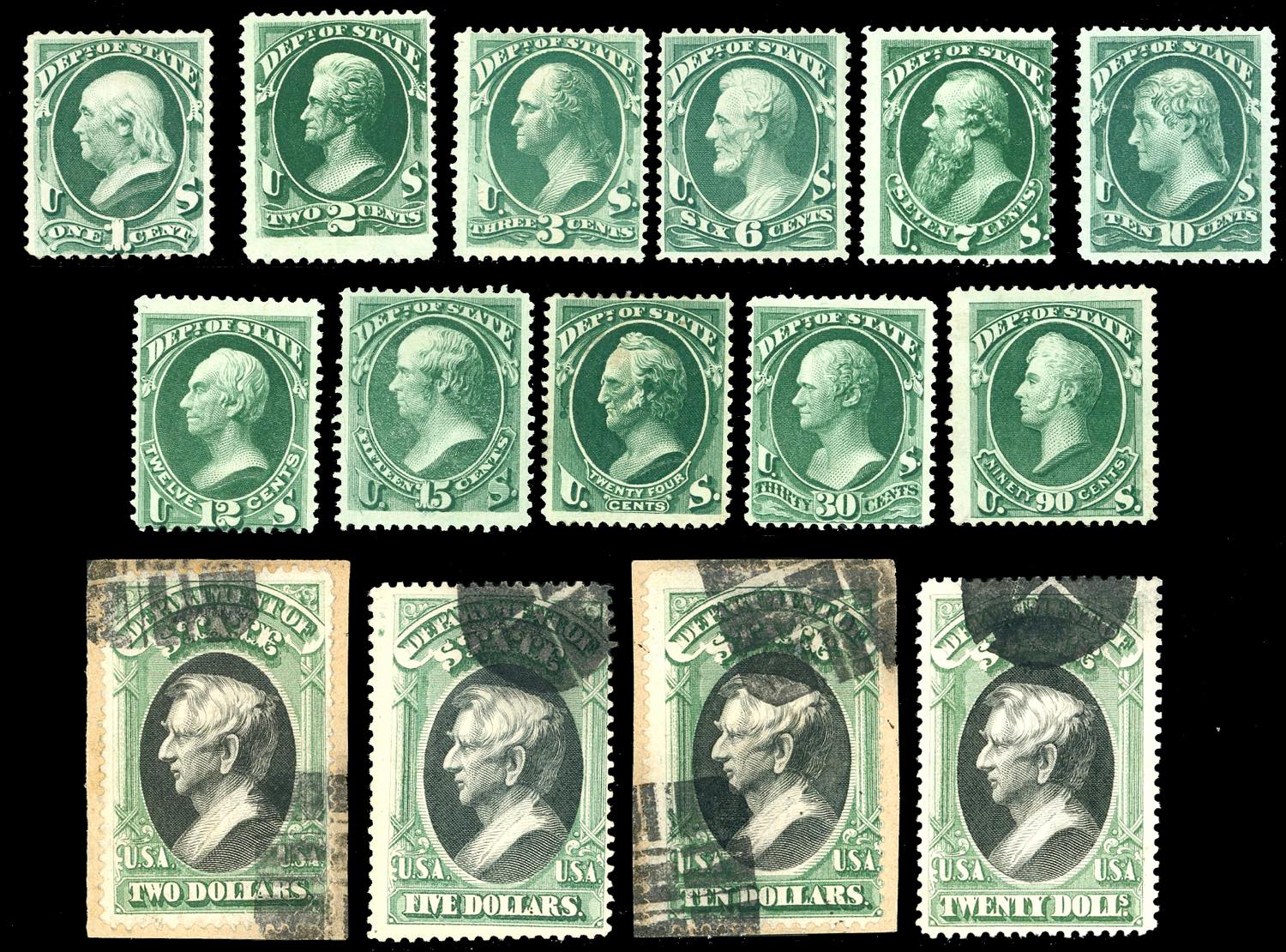 STATI UNITI SERVIZIO 1873 - State, ministero degli Esteri, serie completa (Unif.56/70), nuovi, senza gomma o usati, ottima qualità. Rari.