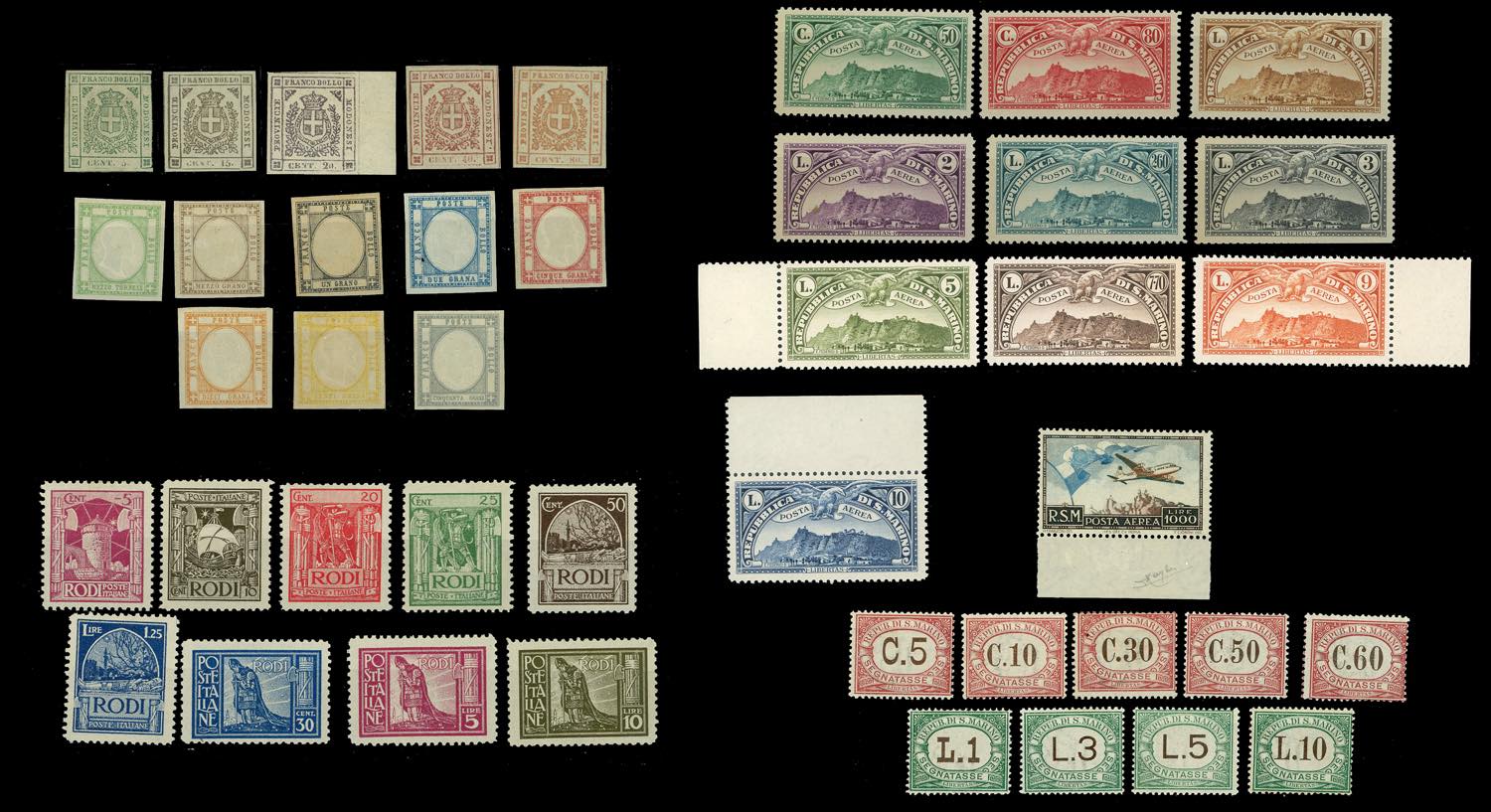 AREA ITALIANA 1859/1951 - Bell'insieme di francobolli e serie del periodo, provenienti da 6 lotti di aste precedenti, ribassati per esaurimento del conferimento. Tre certificati, buon valore di catalogo. Ottimo per professionista.