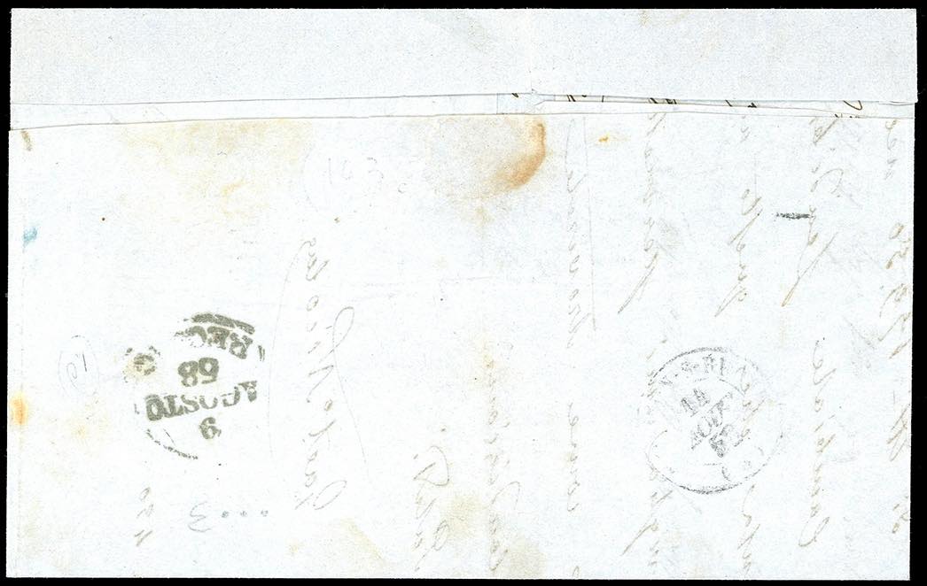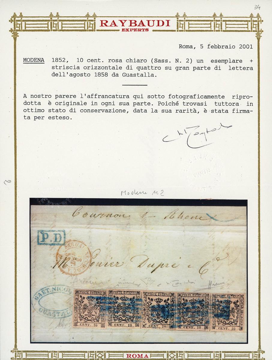 1858 - 10 cent. rosa chiaro, senza punto dopo le cifre, striscia orizzontale di quattro e singolo, perfetti e ben marginati, su gran parte di lettera da Guastalla, agosto 1858, per la Francia. Raro insieme. Grioni, A. ed E.Diena, Sorani, cert. Oro Raybaudi e Chiavarello.