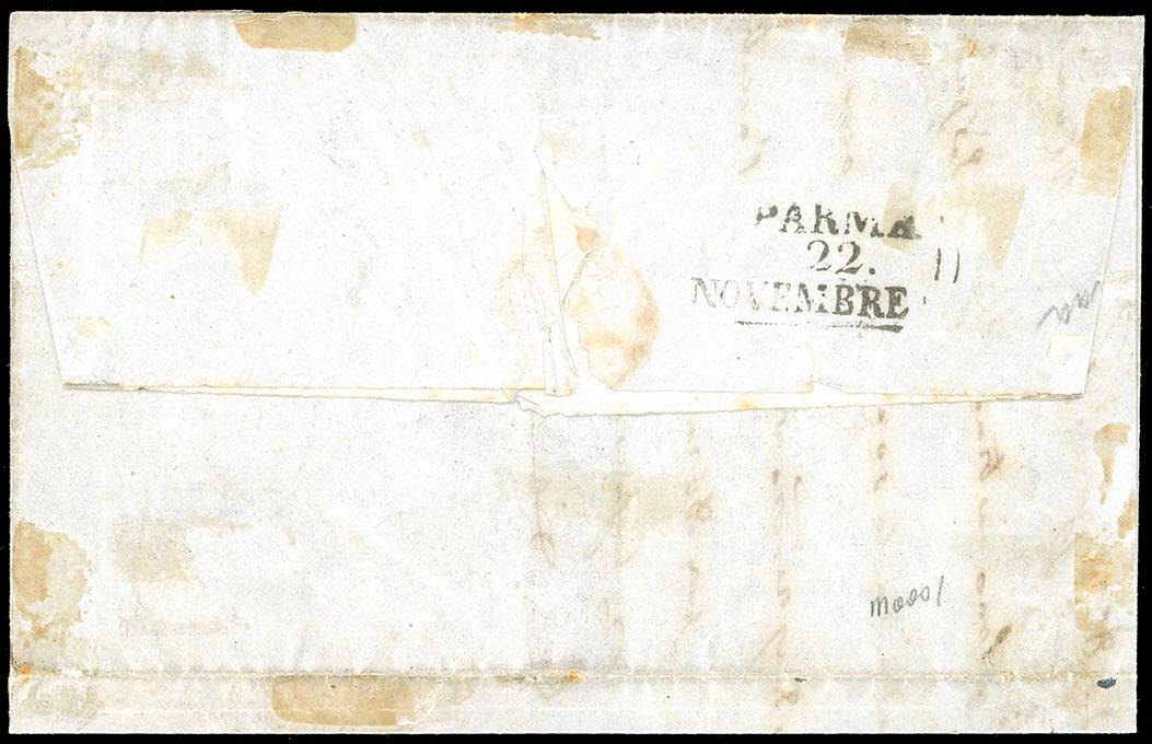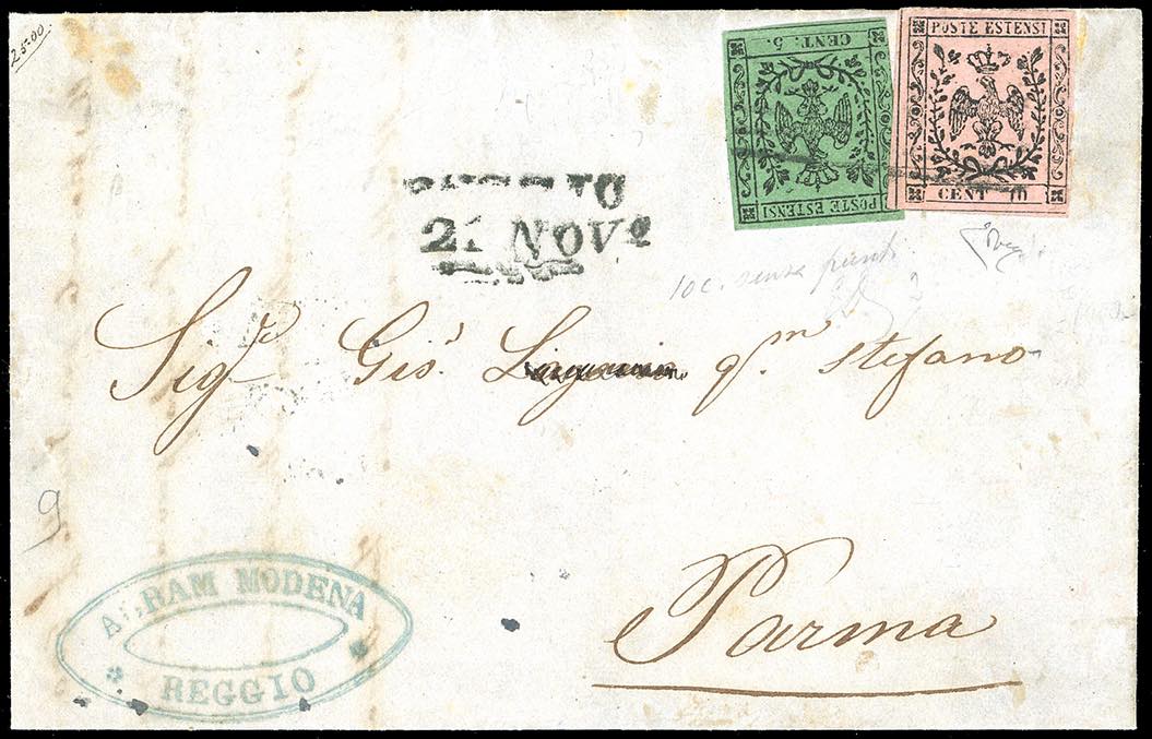 1853 - 10 cent. rosa vivo, varietà tipografica "senza punto dopo cent", perfetto, 5 cent. verde, punto dopo la cifra, ottimo stato (2b,7), su lettera da Reggio 21/11/1853 a Parma. Em.Diena, cert. E.Diena.