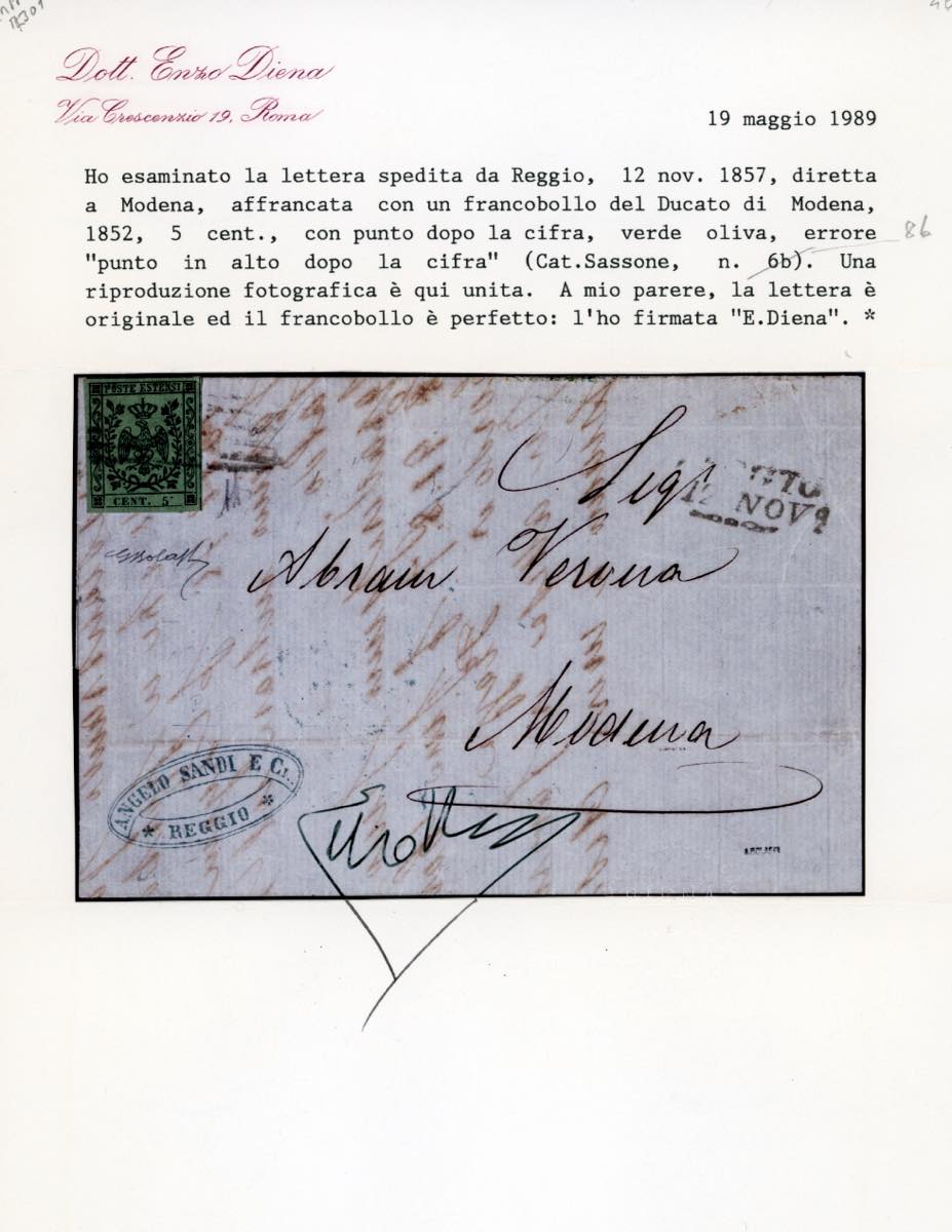 1857 - 5 cent. verde oliva, errore tipografico "punto in alto dopo il 5" (8b), perfetto, su lettera da Reggio 12/11/1857 a Modena. Bella. G.Bolaffi, A.Diena, cert. E.Diena.